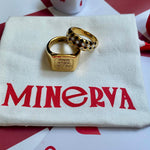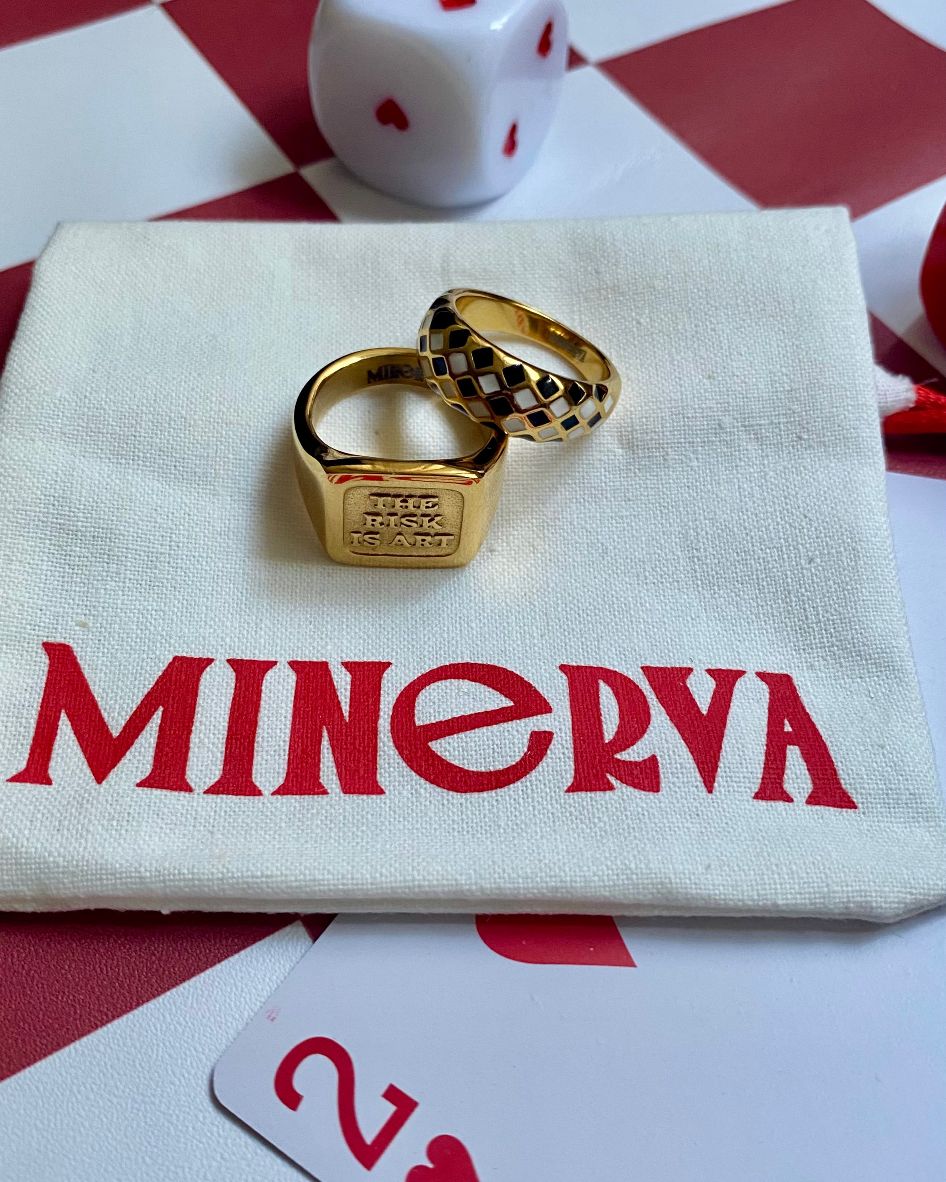 Gold stainless steel ring Hypoallergenic gold-plated seal style with the phrase "risk is art"