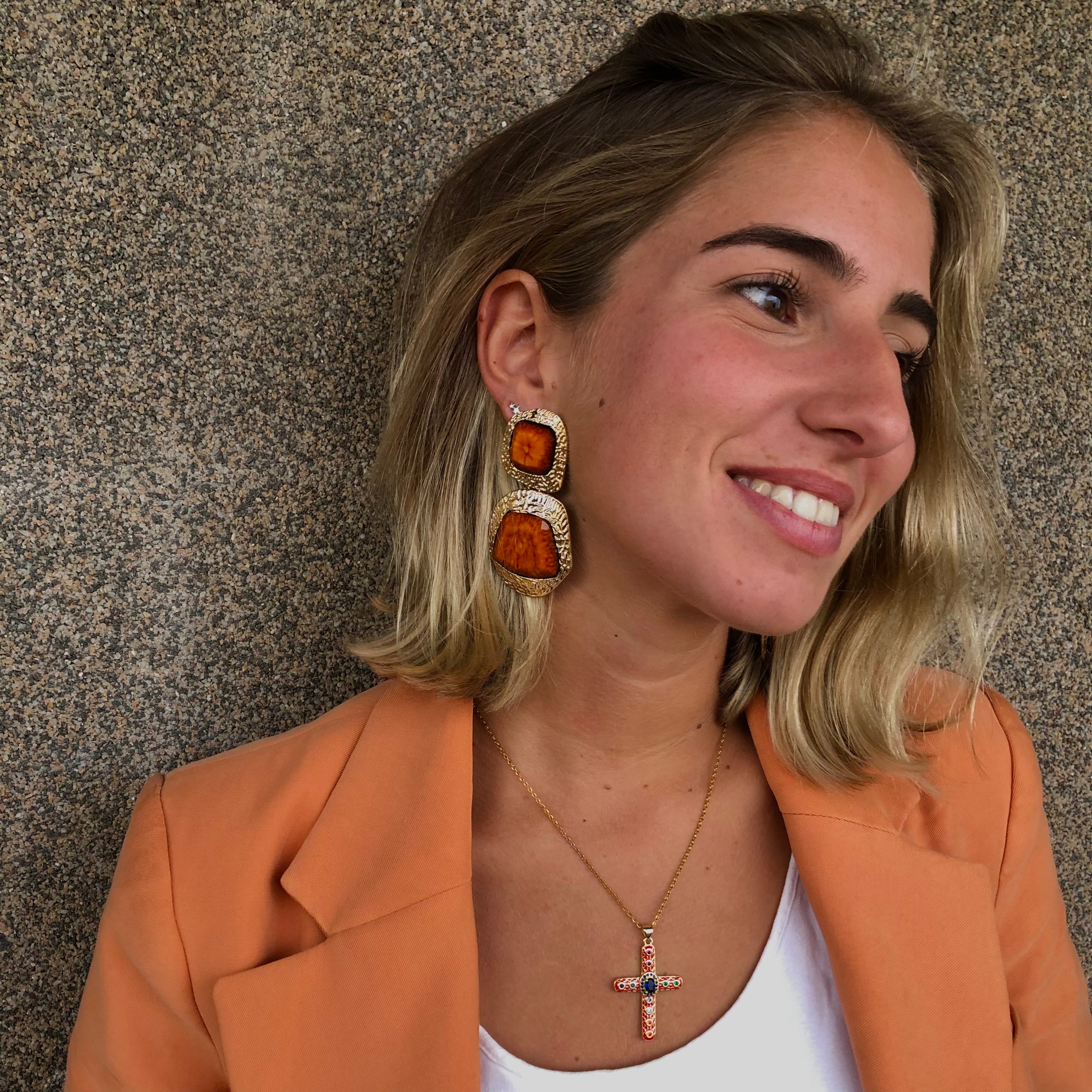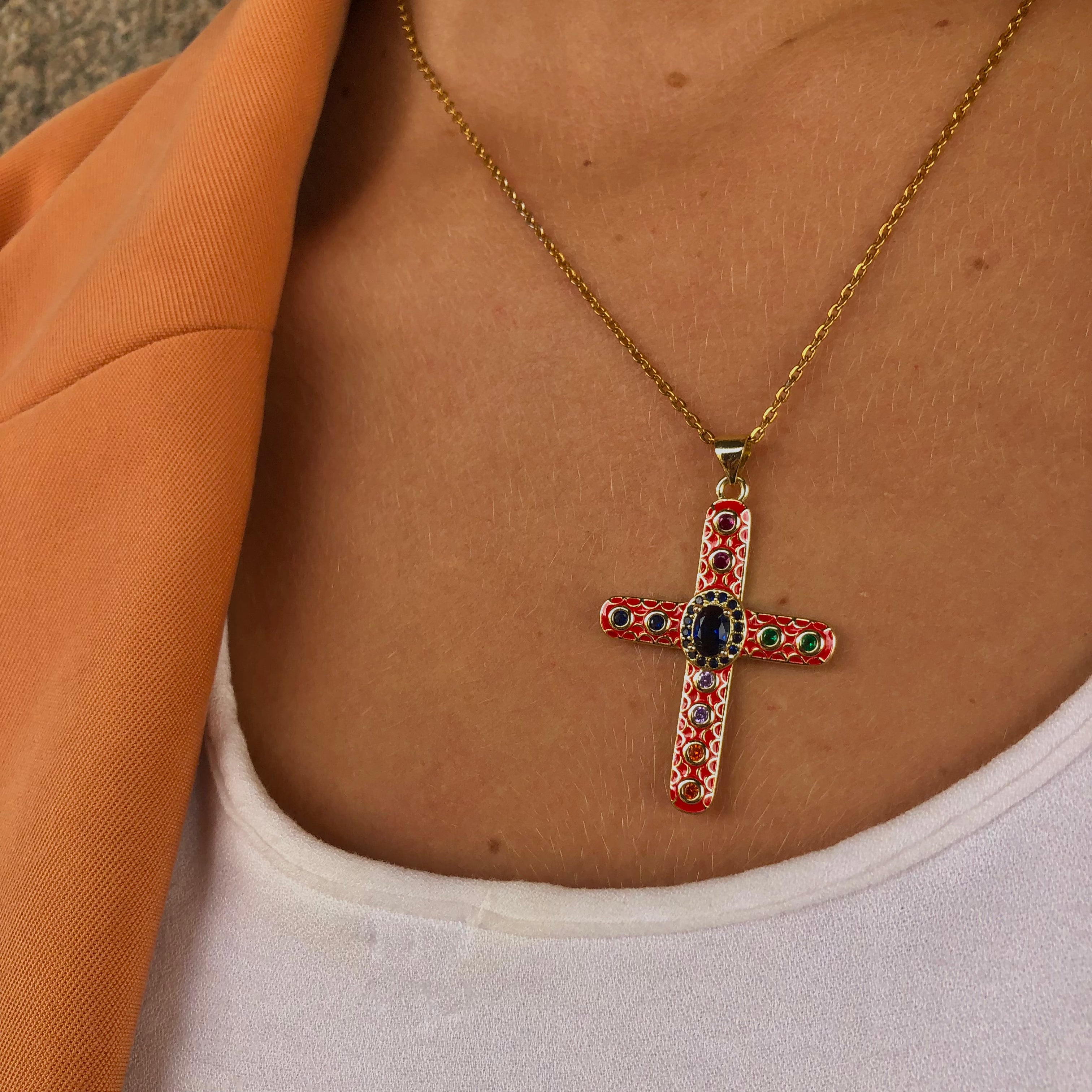 Chain necklace with a gold cross pendant with enamel and red enamel and with a central white stone and colored stones at the ends.
