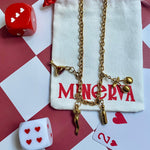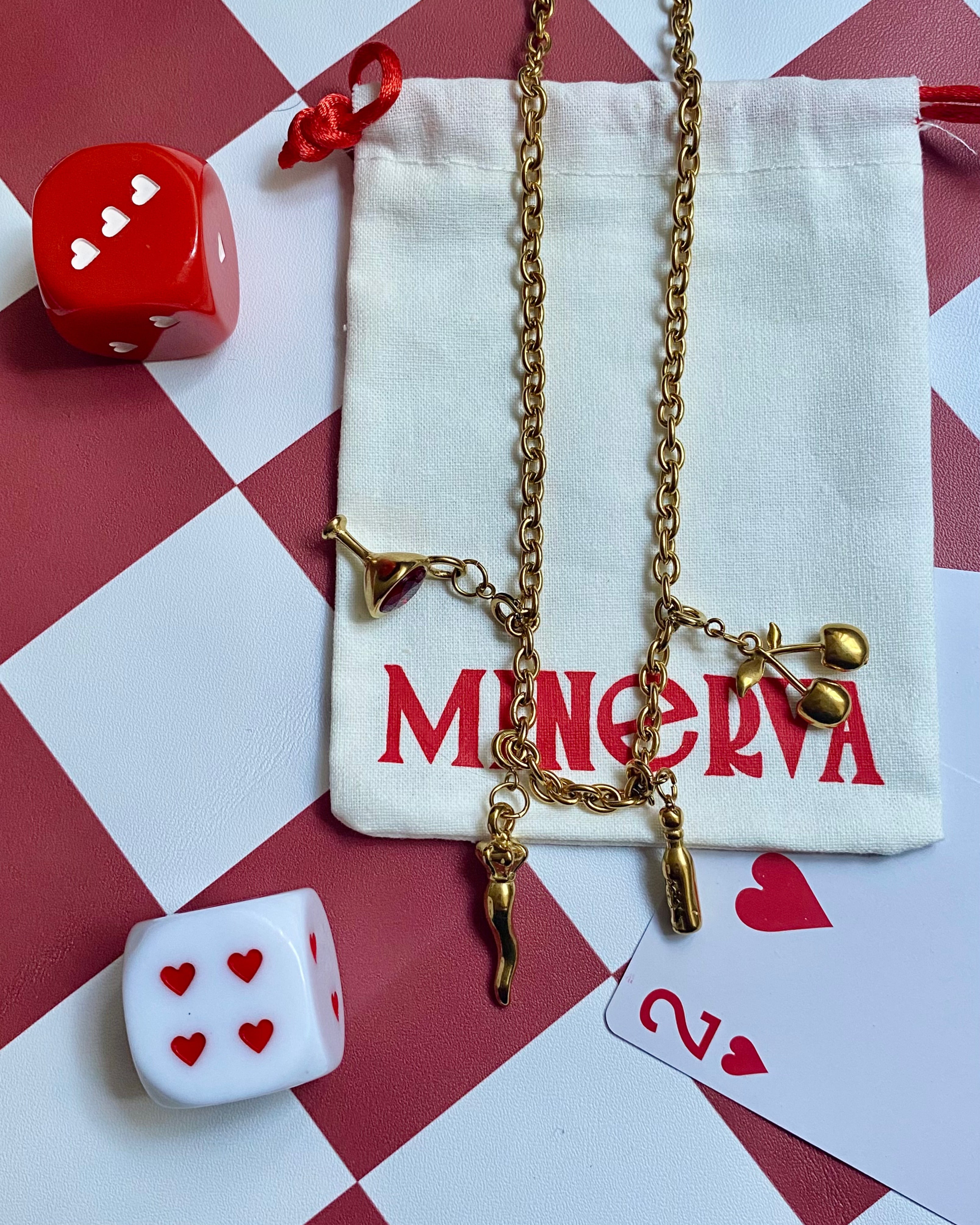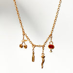 Hypoallergenic gold-plated stainless steel chain necklace with 4 interchangeable lucky charms: a pepper, a bottle of hot sauce, cherries, and a wine glass.