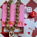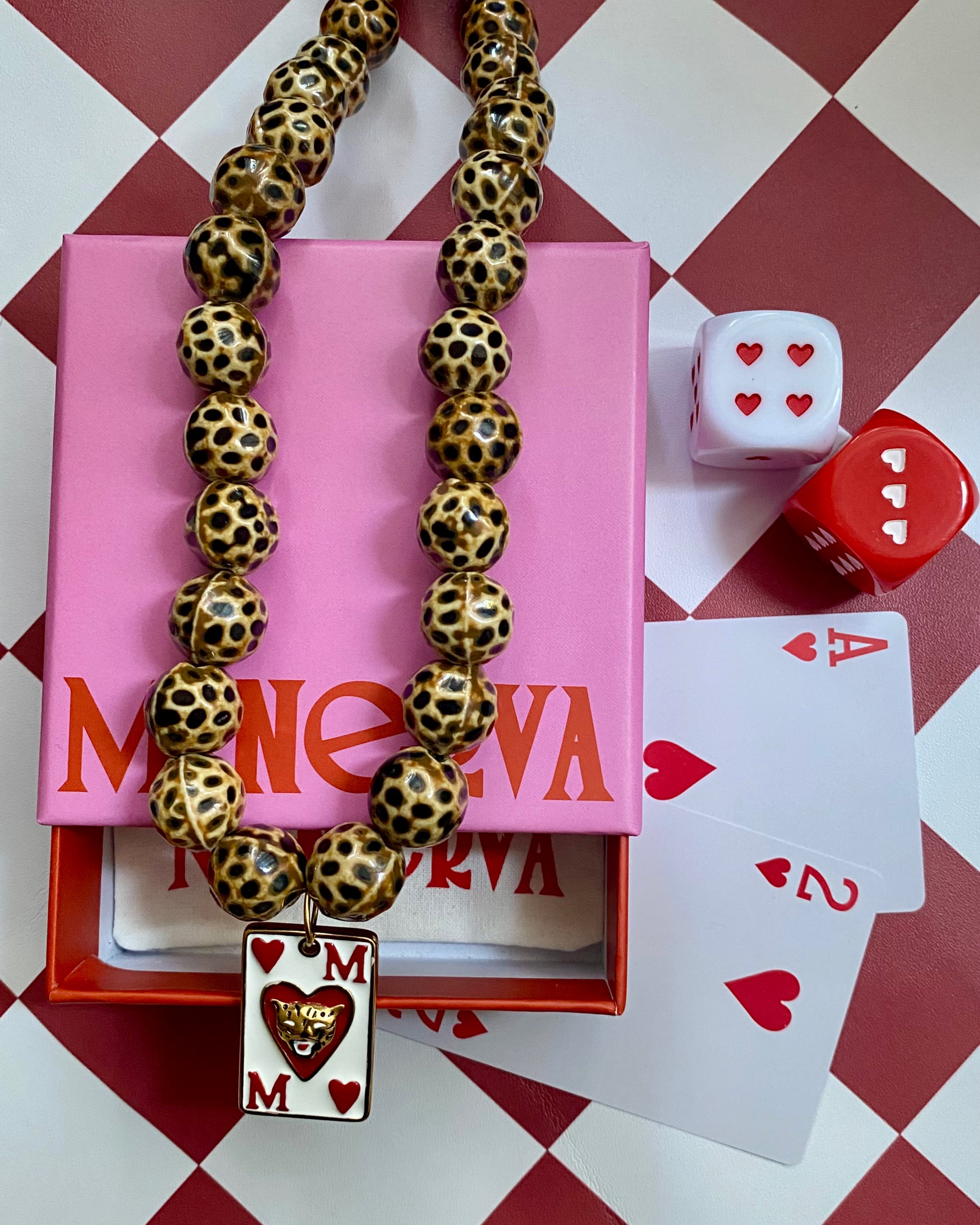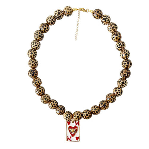 Animal print ceramic bead necklace with a playing card charm featuring a tiger with a heart.