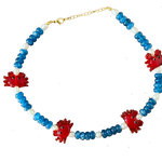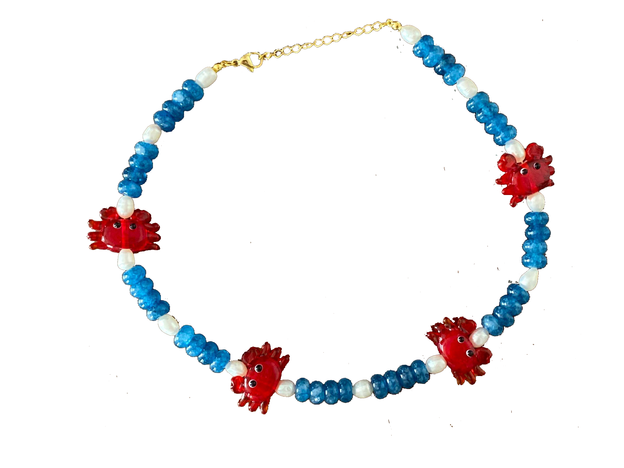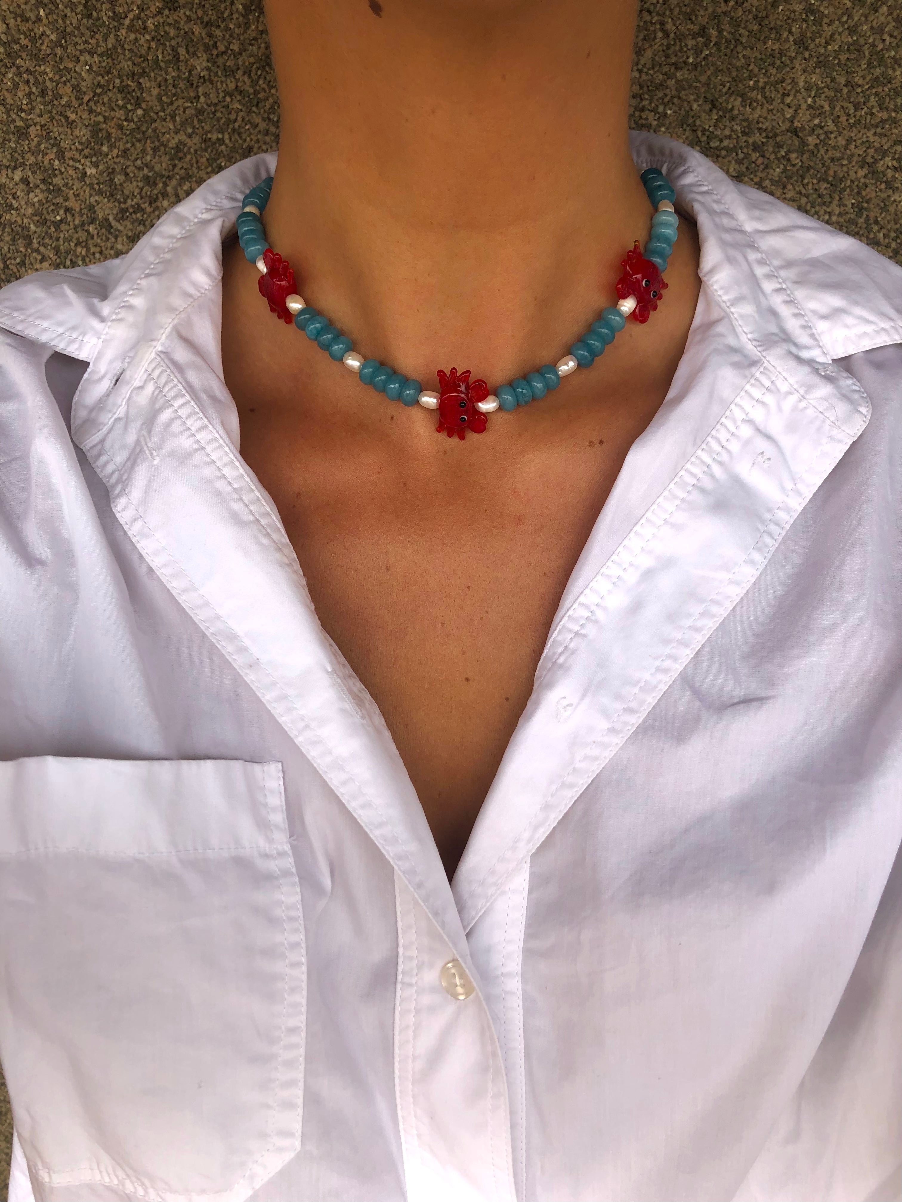 Choker of blue glass beads interspersed with river pearls and with blown glass red-green crab-shaped charms. Different, fresh and original.
