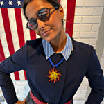 Necklace of blue and purple natural crystal beads of varying sizes with handmade yellow and orange sun-shaped bead charms. Different, fresh, and original.