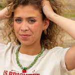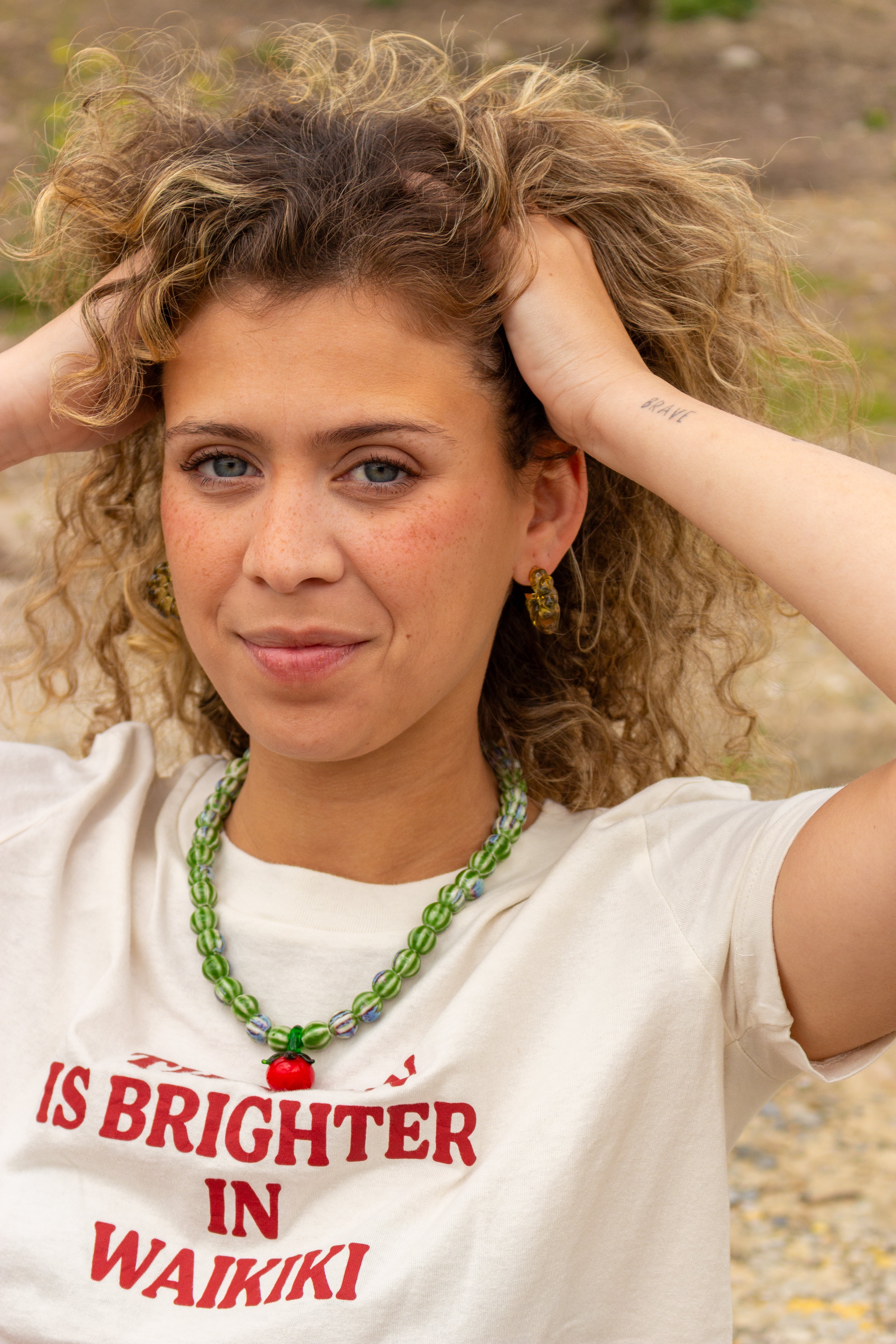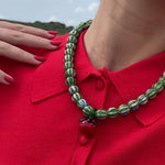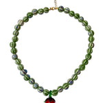 Green hand-painted ceramic bead necklace with a tomato-shaped Murano glass charm. Different, fresh, and original.