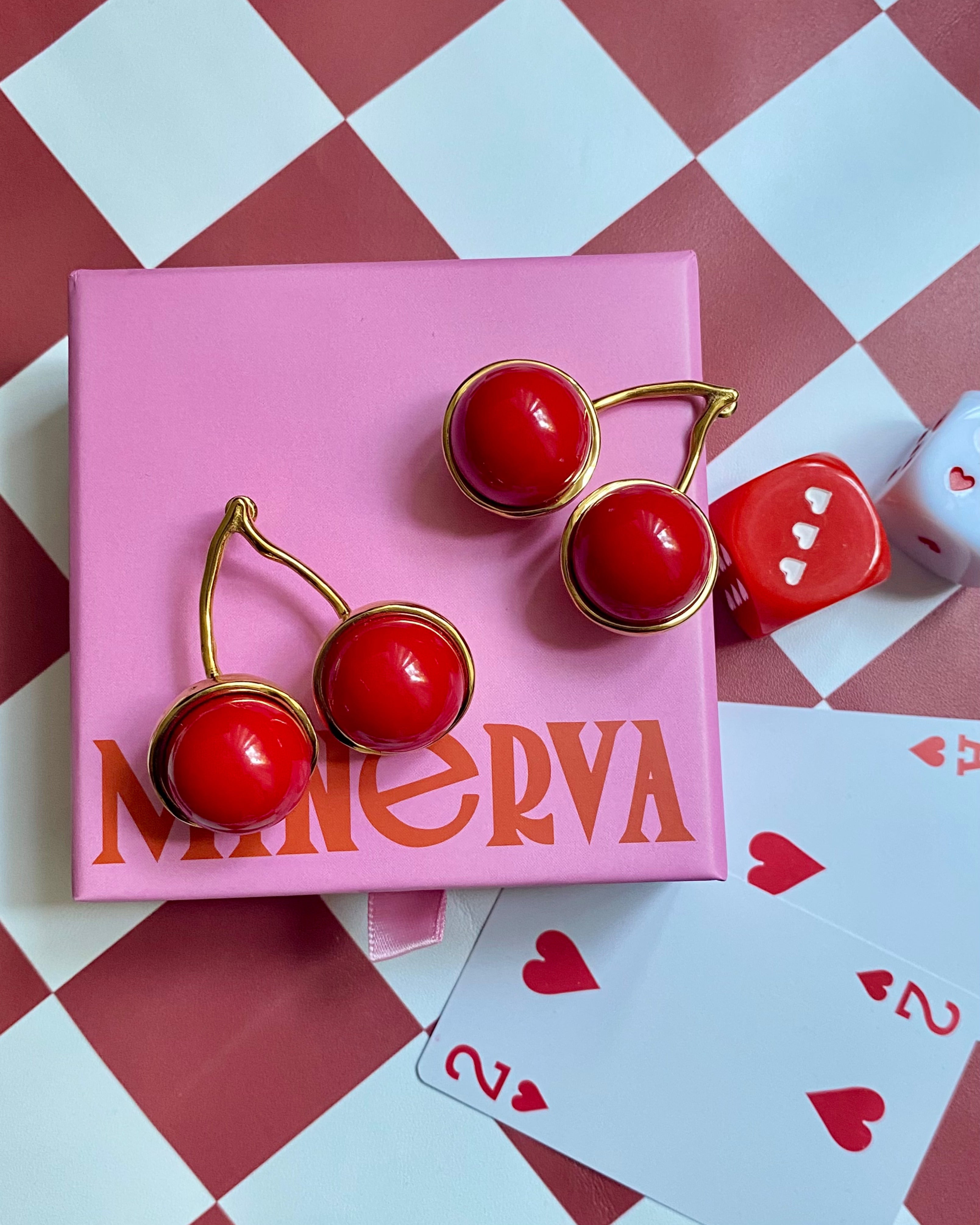 Gold-plated hypoallergenic stainless steel cherry-shaped earrings with two red beads