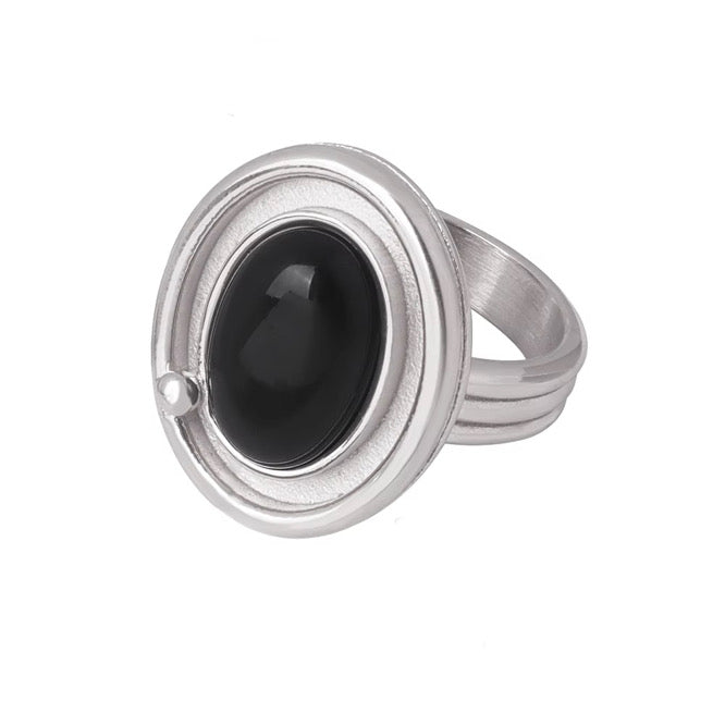 Anillo plateado de acero inoxidable hipoalergénico con piedra redonda de ágata.