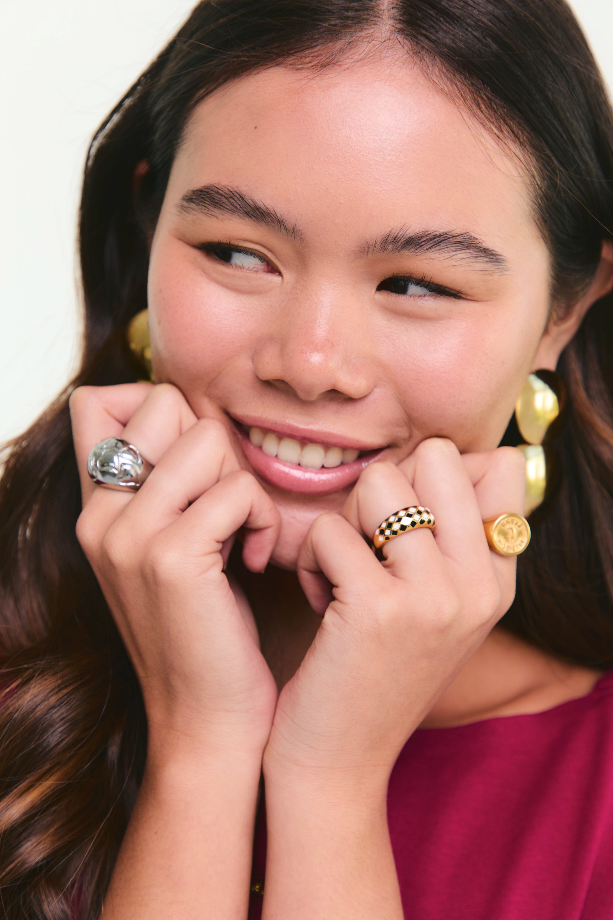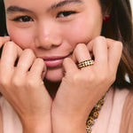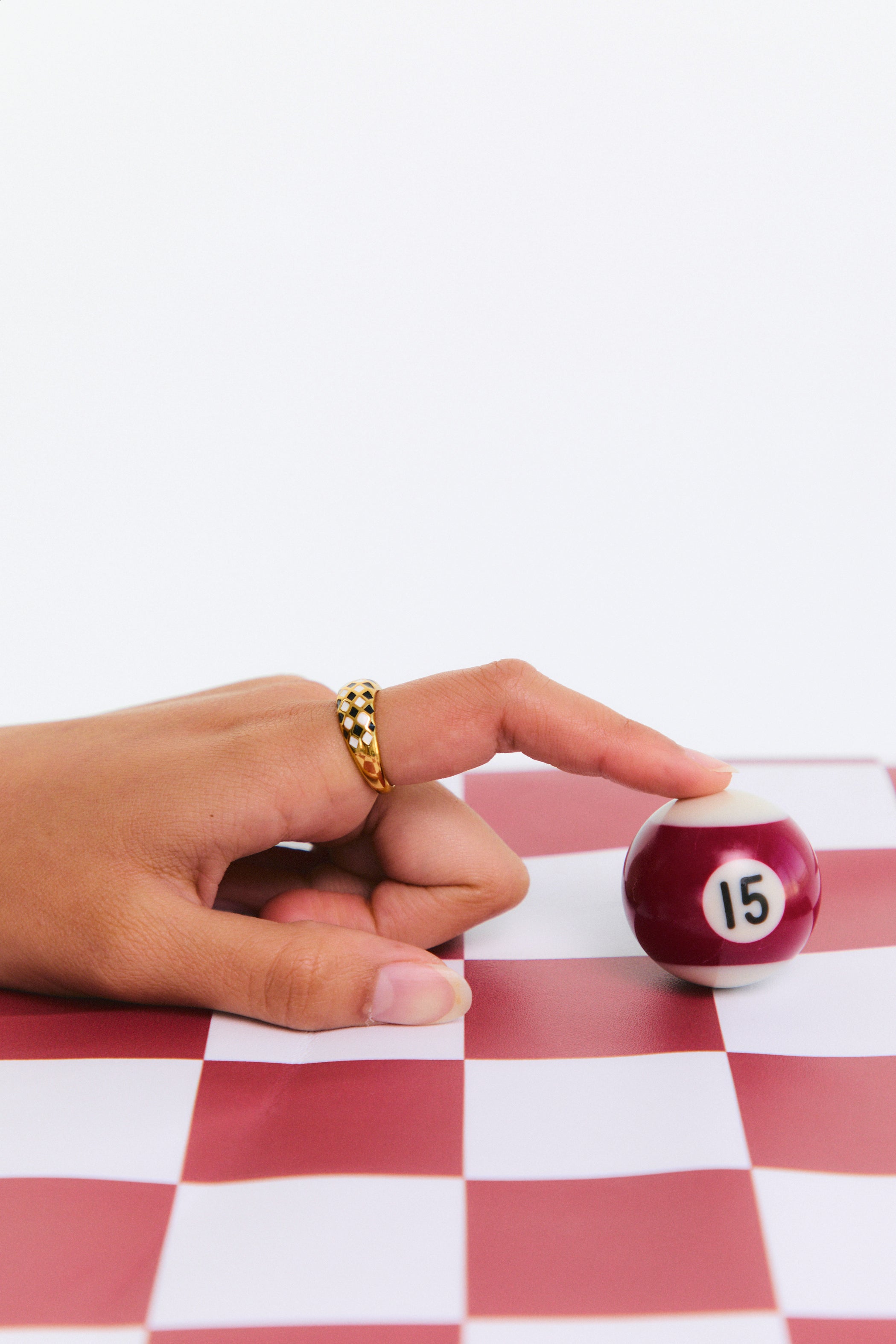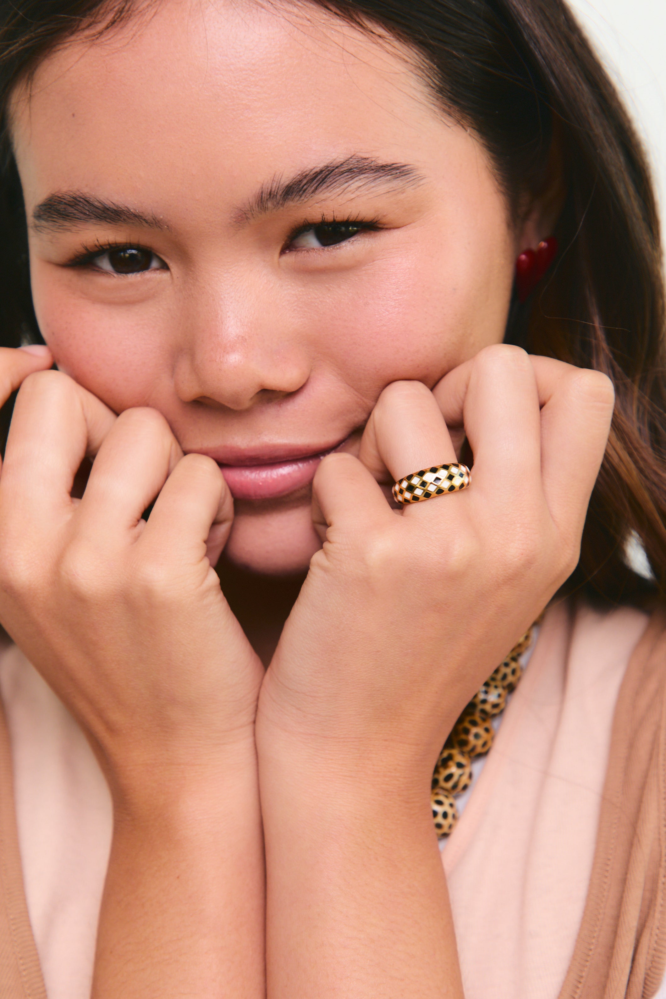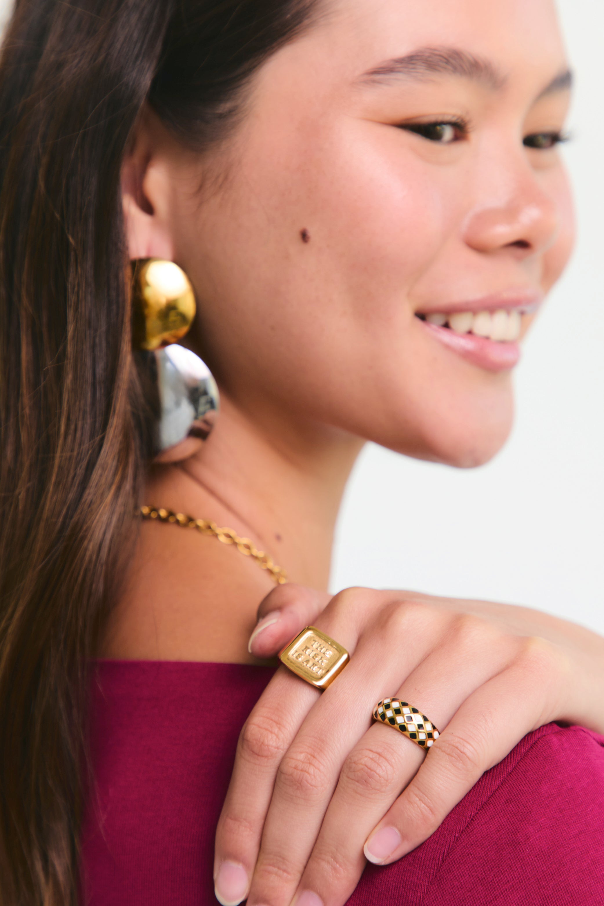 Anillo dorado de acero inoxidable hipoalergénico bañado en oro con detalles de rombos en color blanco y negro