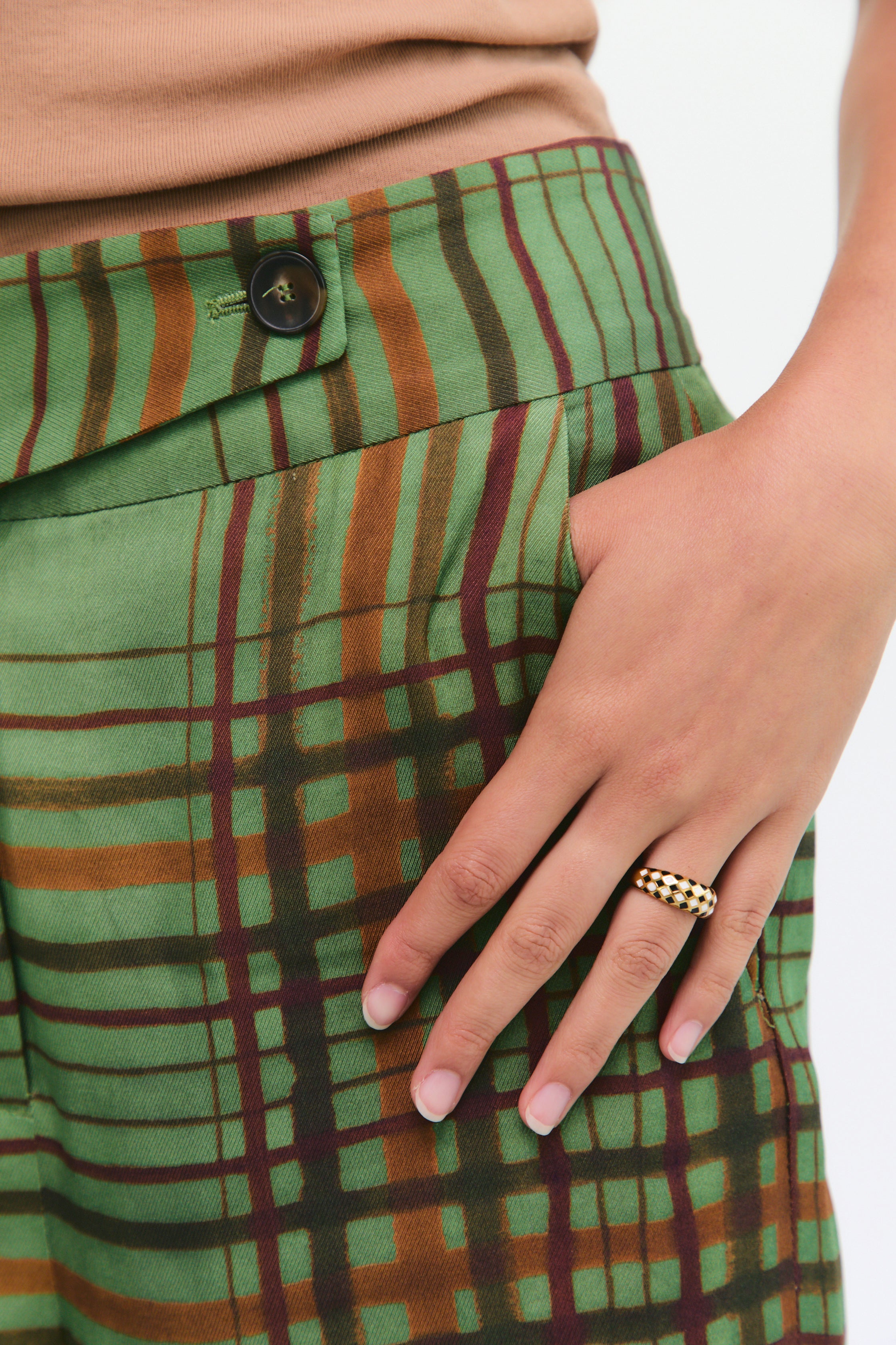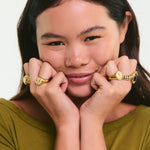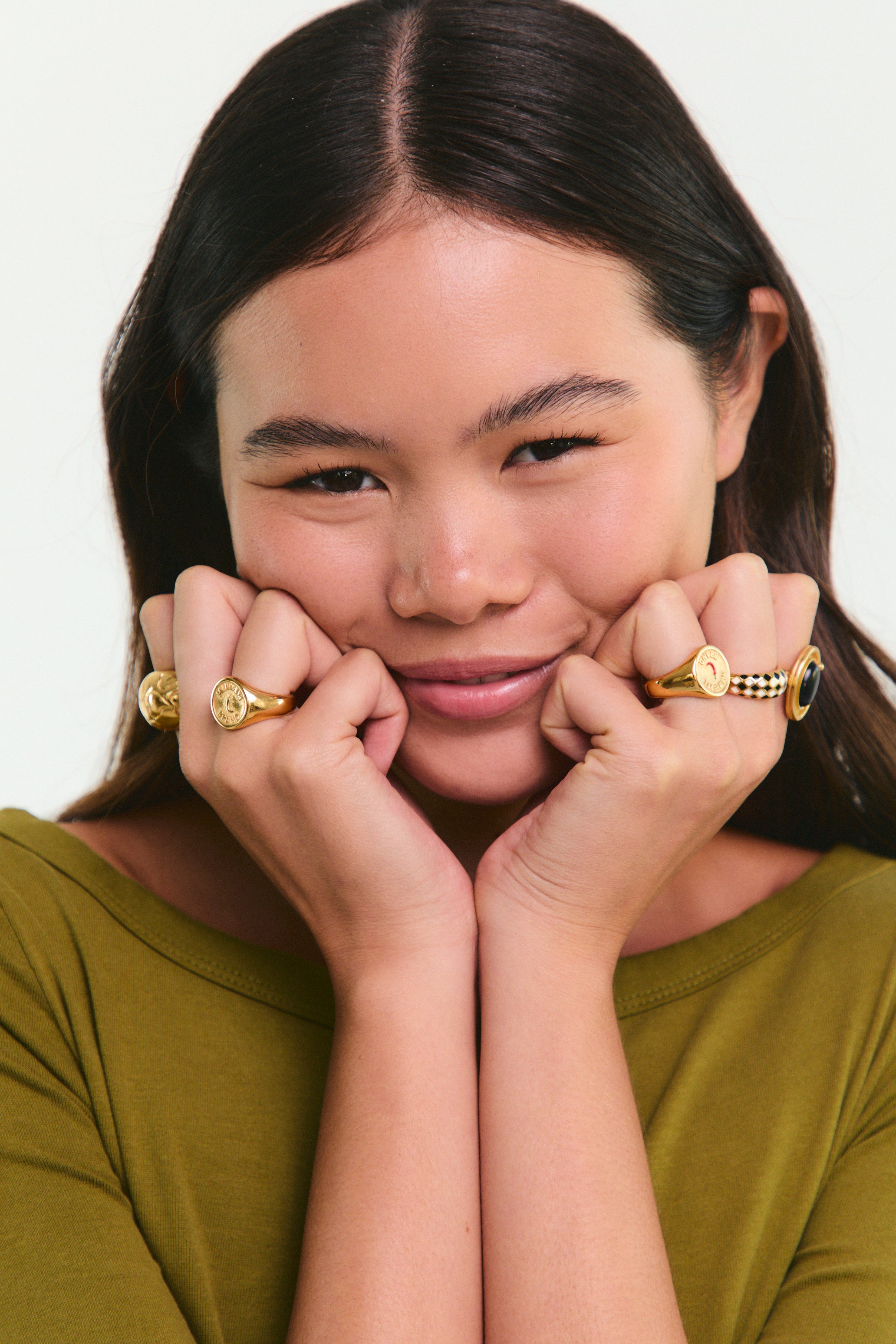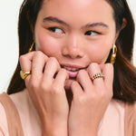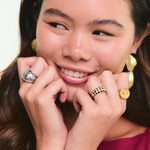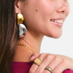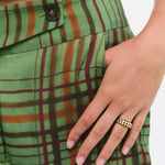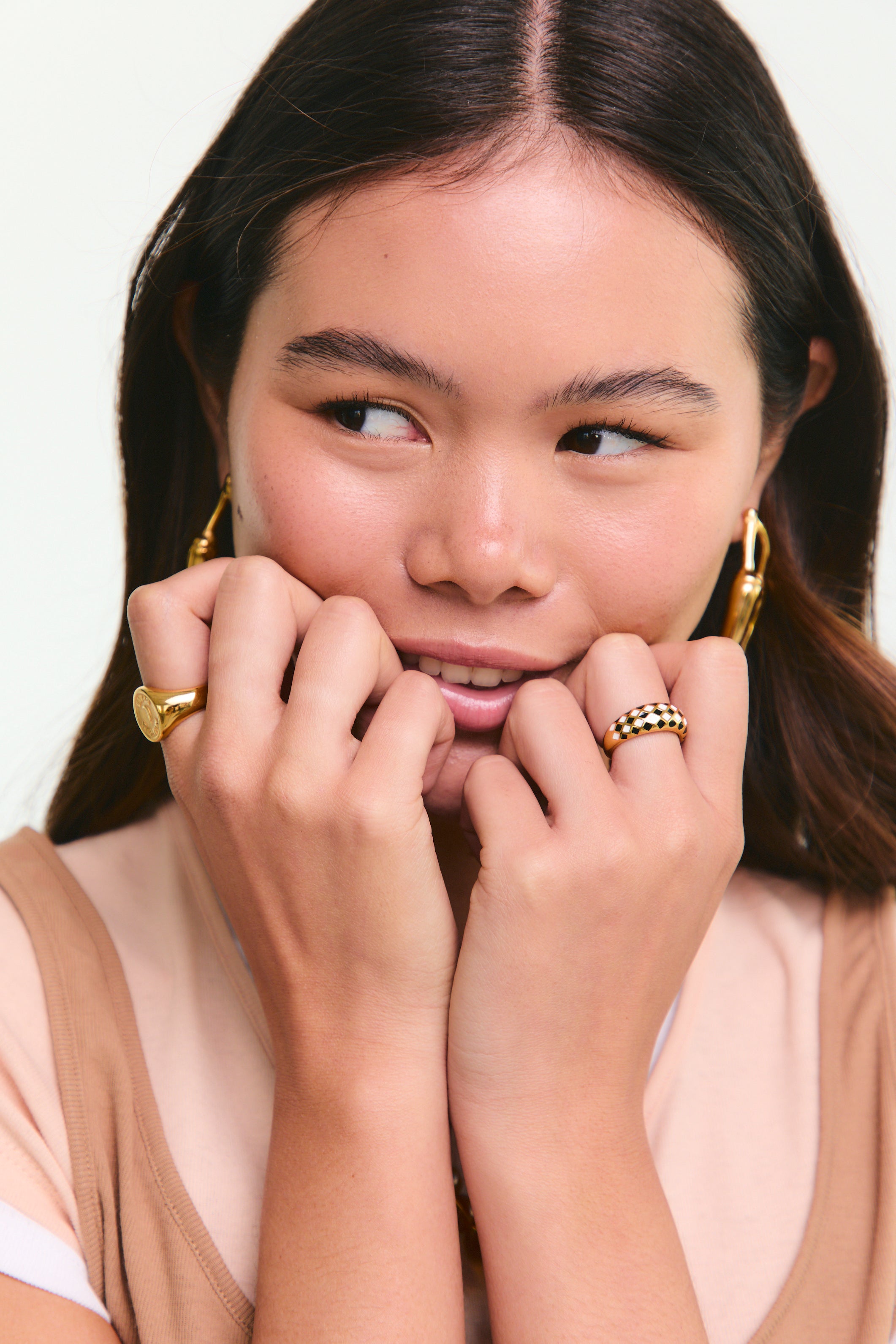 Anillo dorado de acero inoxidable hipoalergénico bañado en oro con detalles de rombos en color blanco y negro