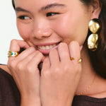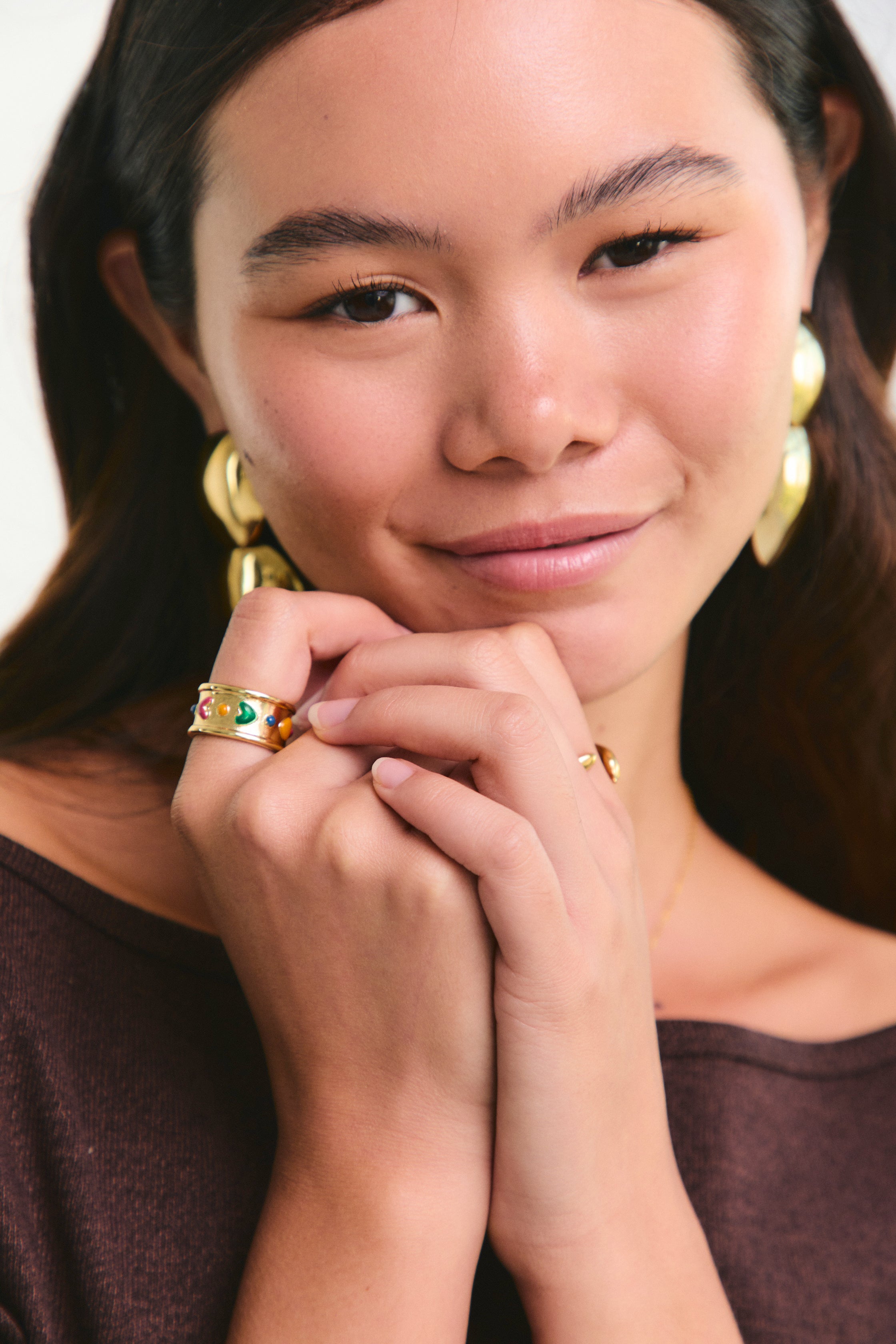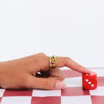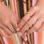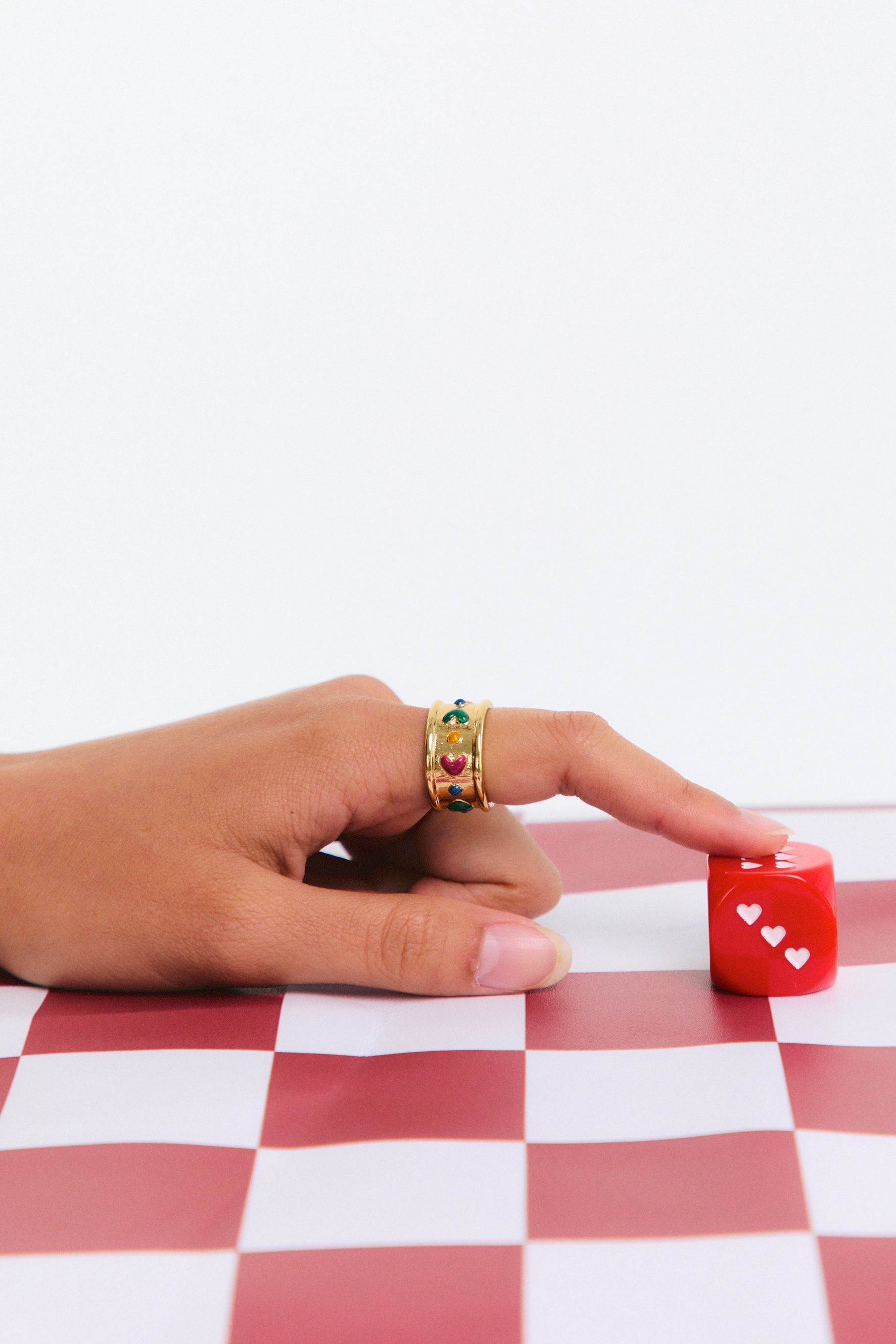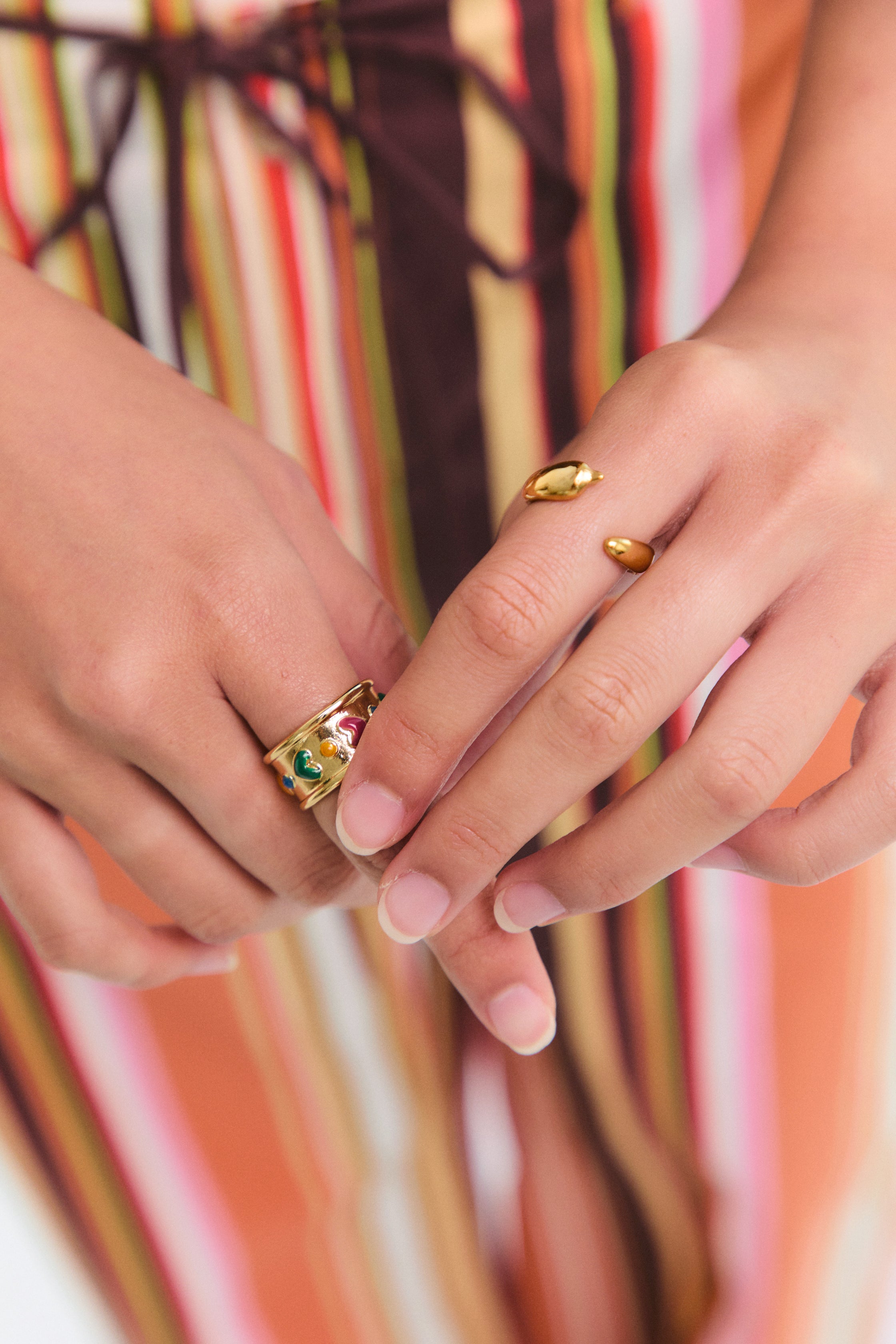 Anillo dorado de acero inoxidable hipoalergénico bañado en oro con detalles de corazones y rombos en diferentes colores