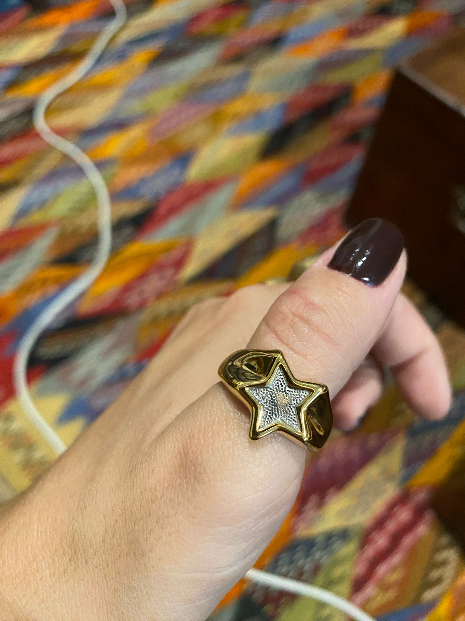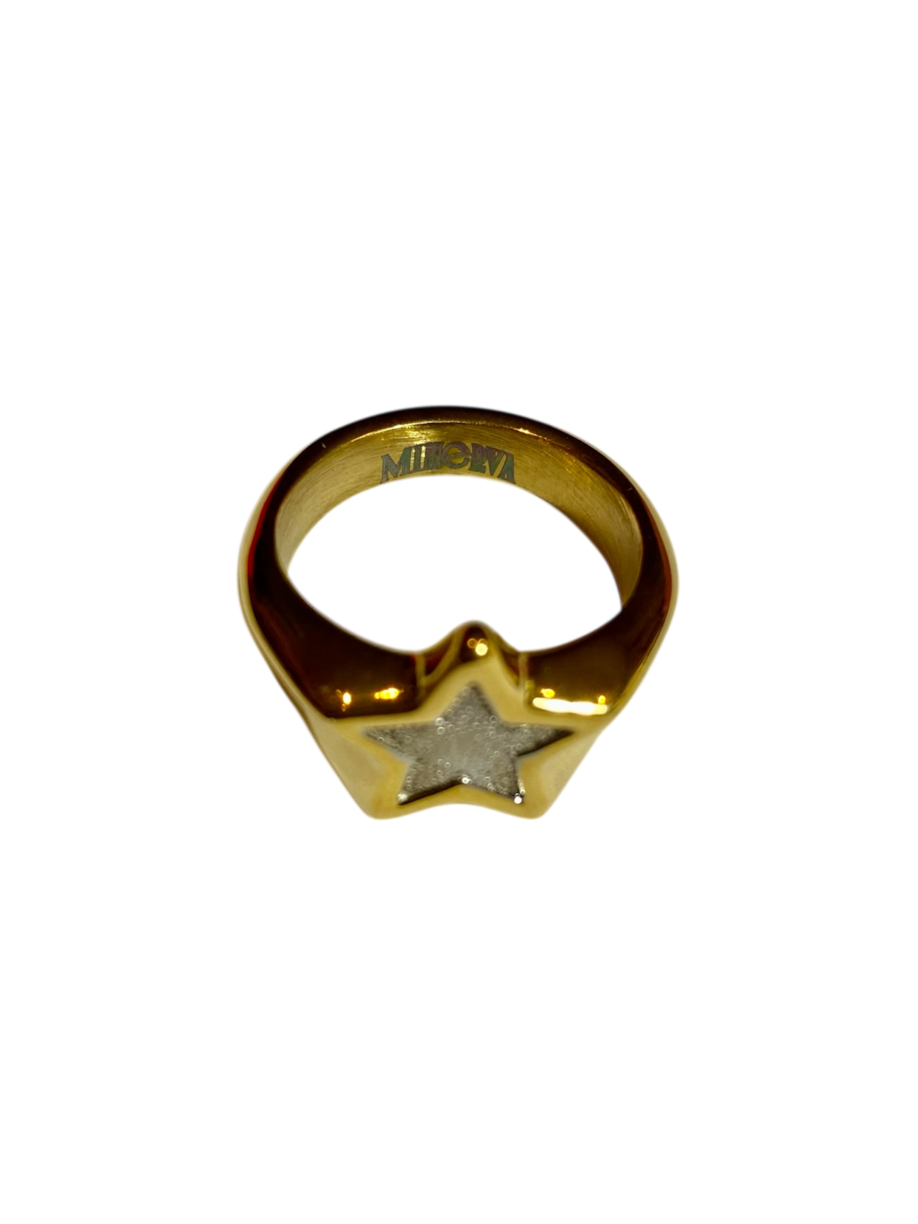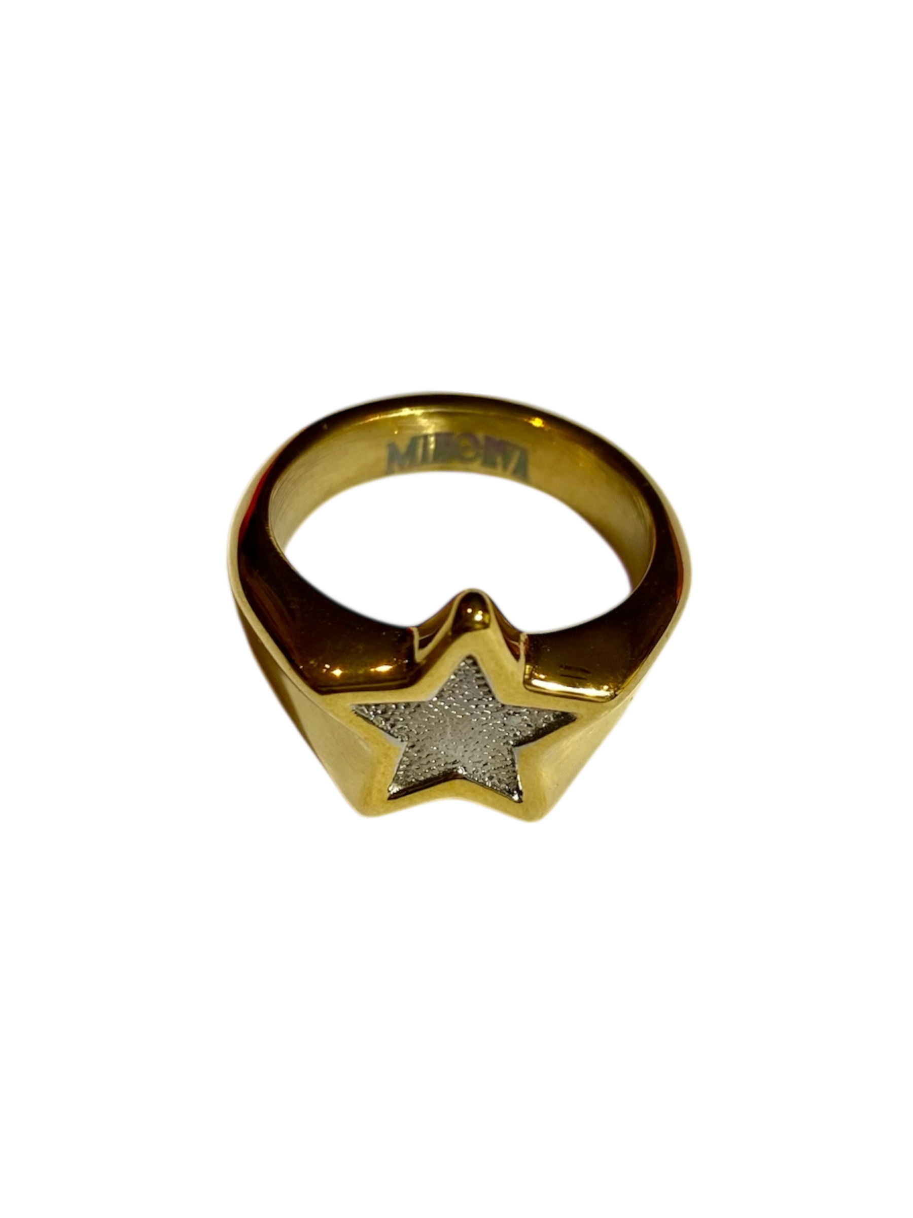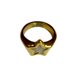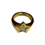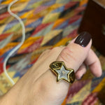 Anillo  de acero inoxidable hipoalergénico plateado y bañado en oro estilo martilleado con forma de estrella dorada con detalles en el interior plateados