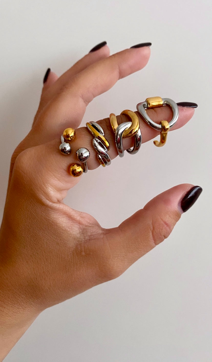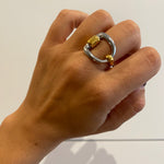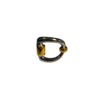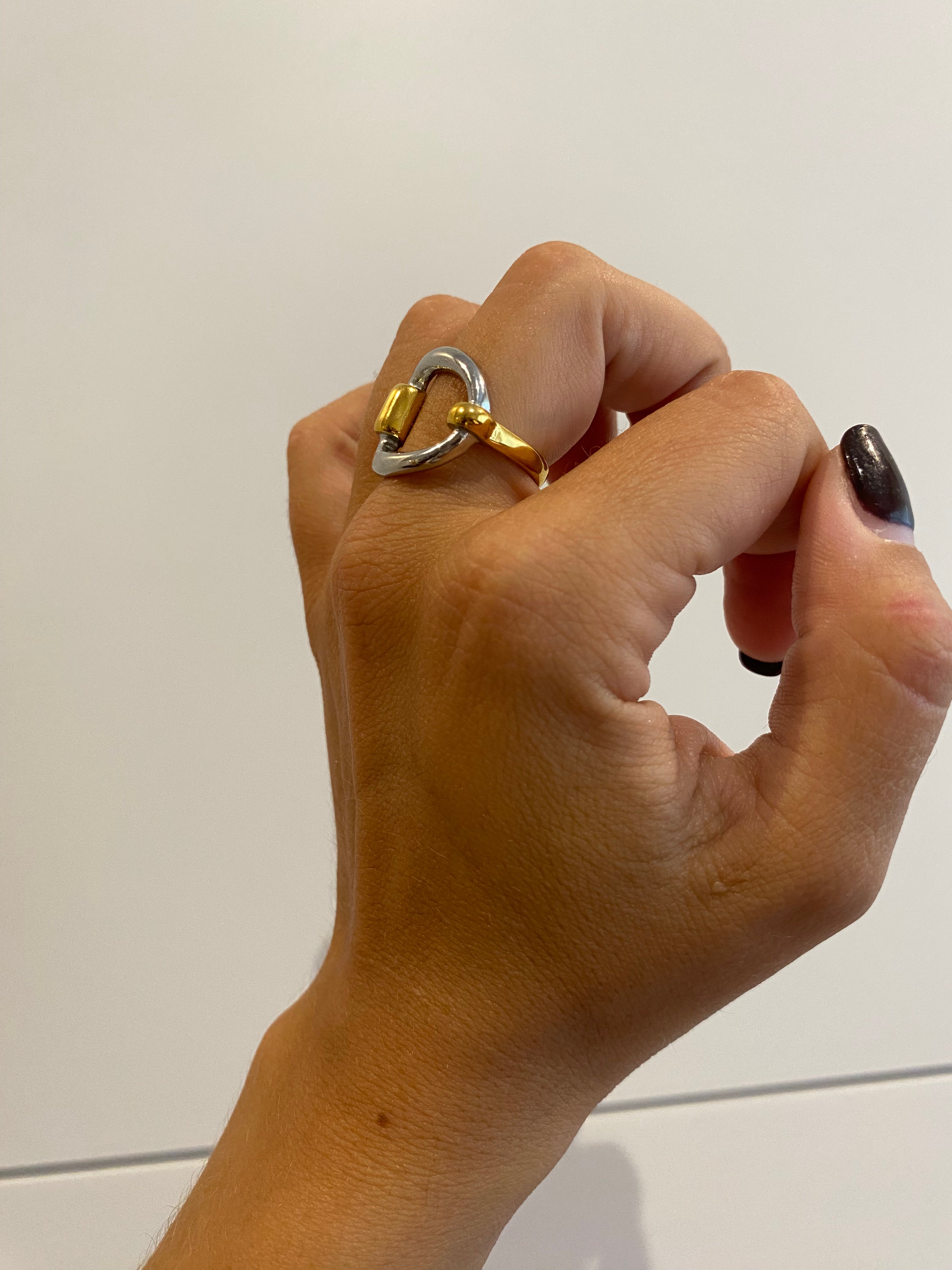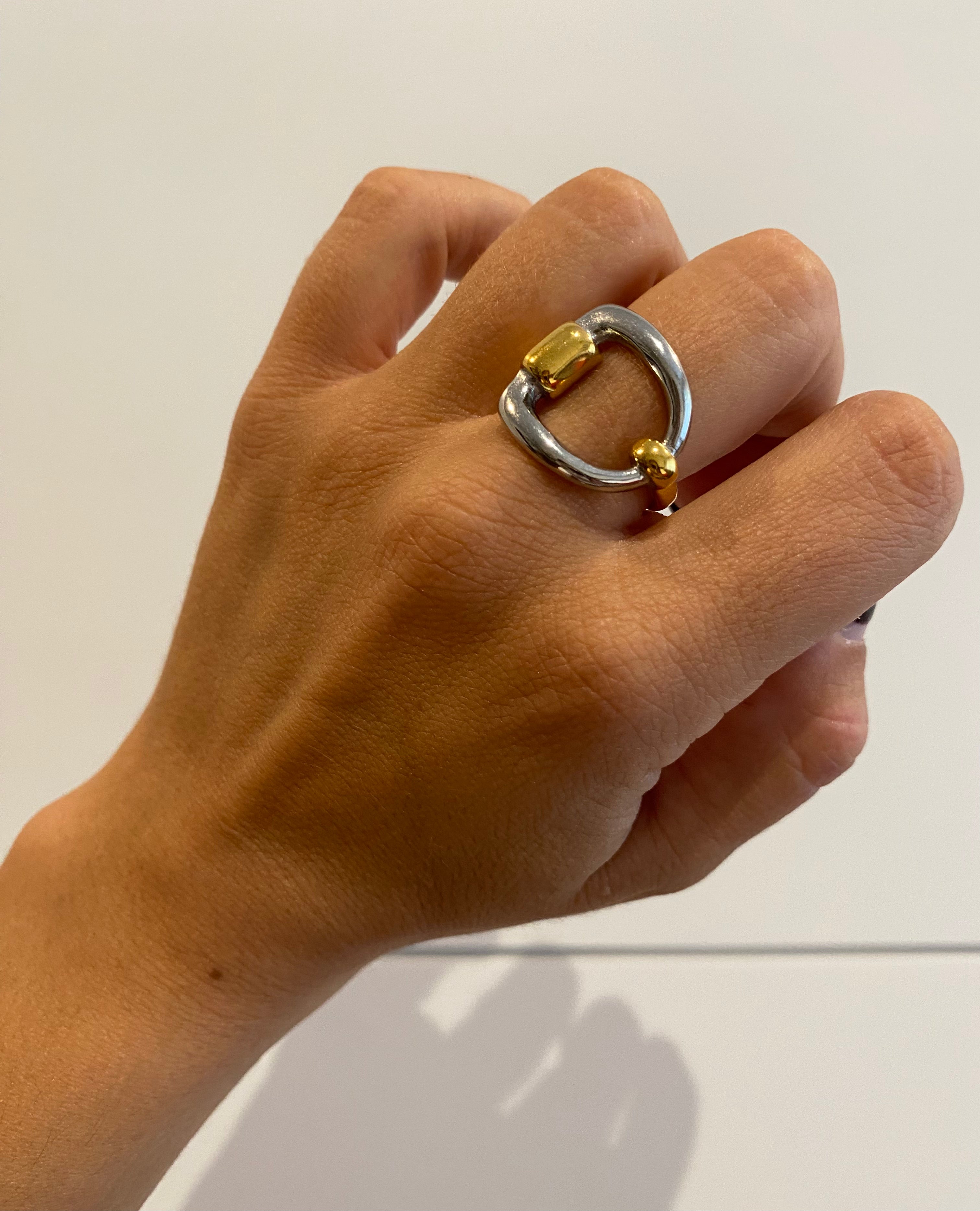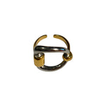 Anillo de acero inoxidable de mezcla dorado y plateado con forma de estribo y apertura posterior. Estilo Vintage