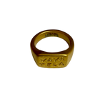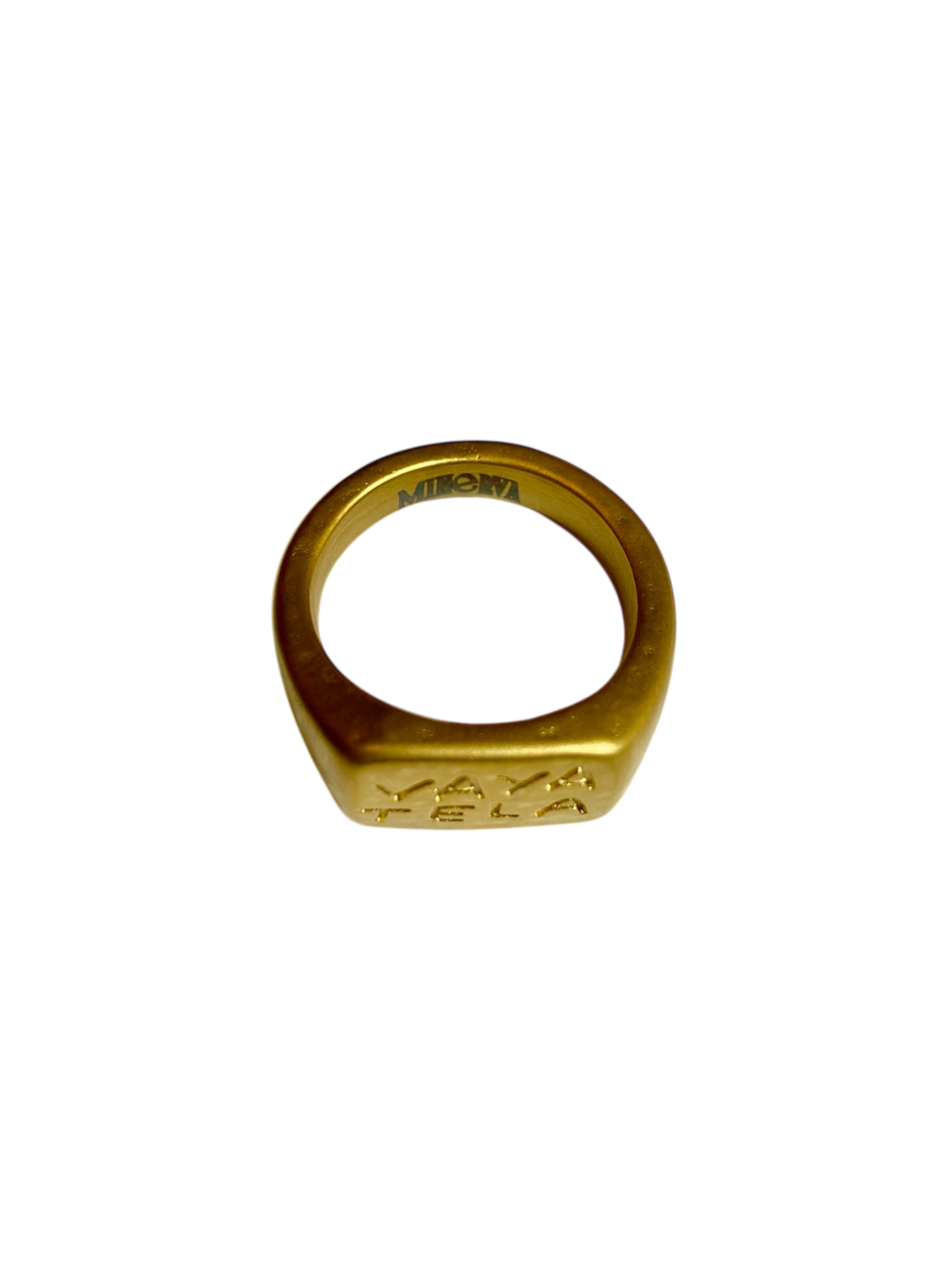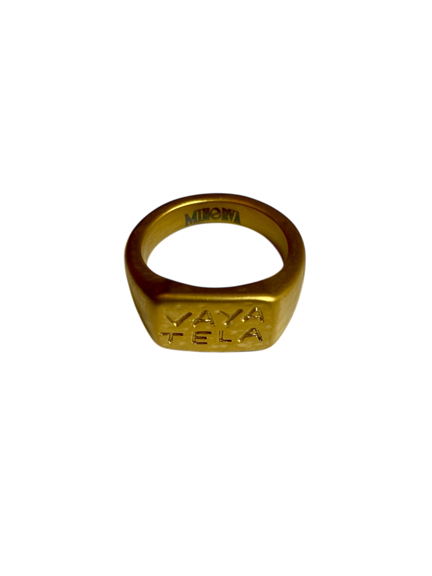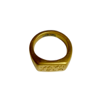 Anillo dorado de acero inoxidable hipoalergénico bañado en oro estilo sello con las palabras "vaya tela" y con detalles martilleados