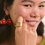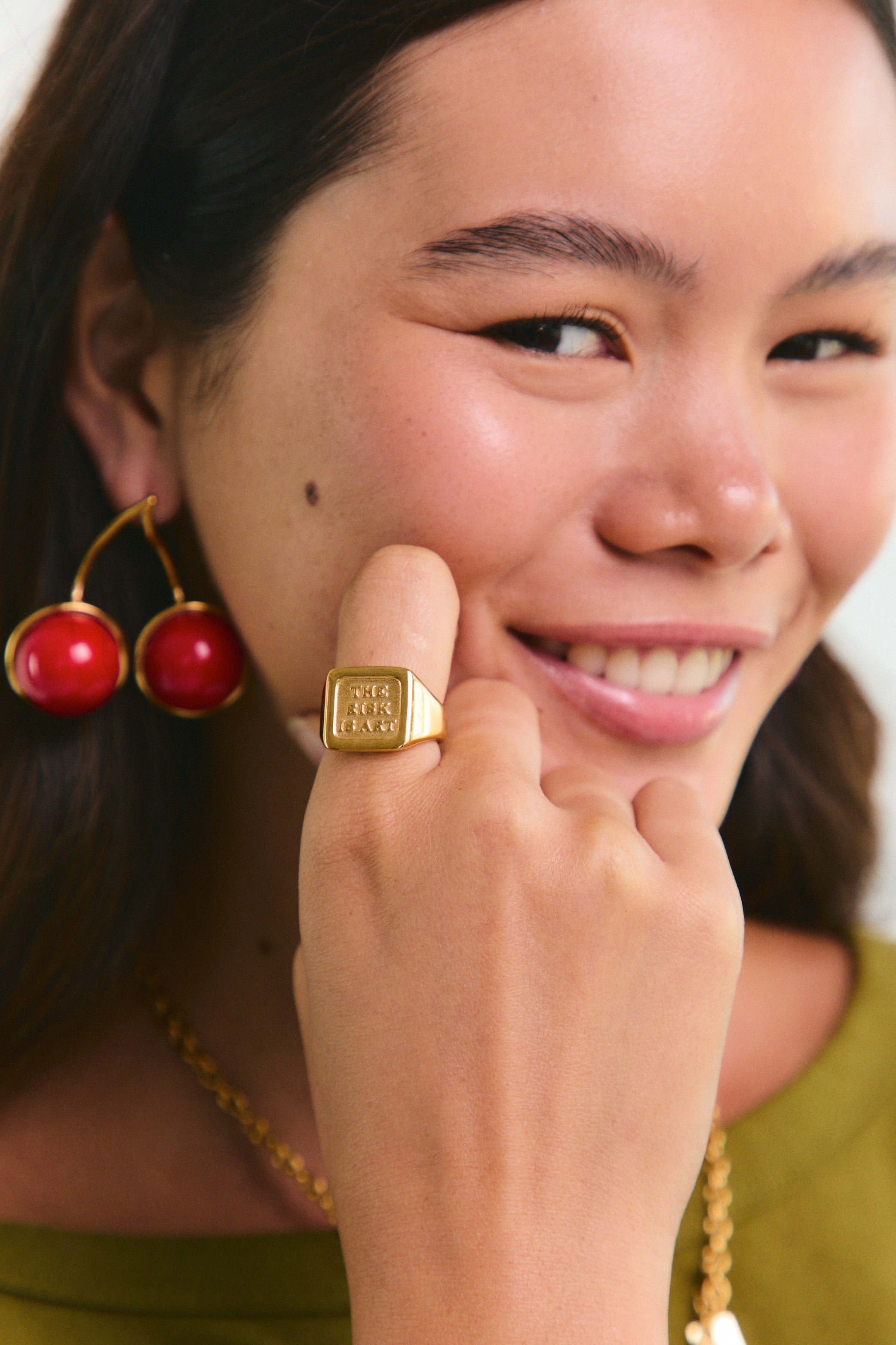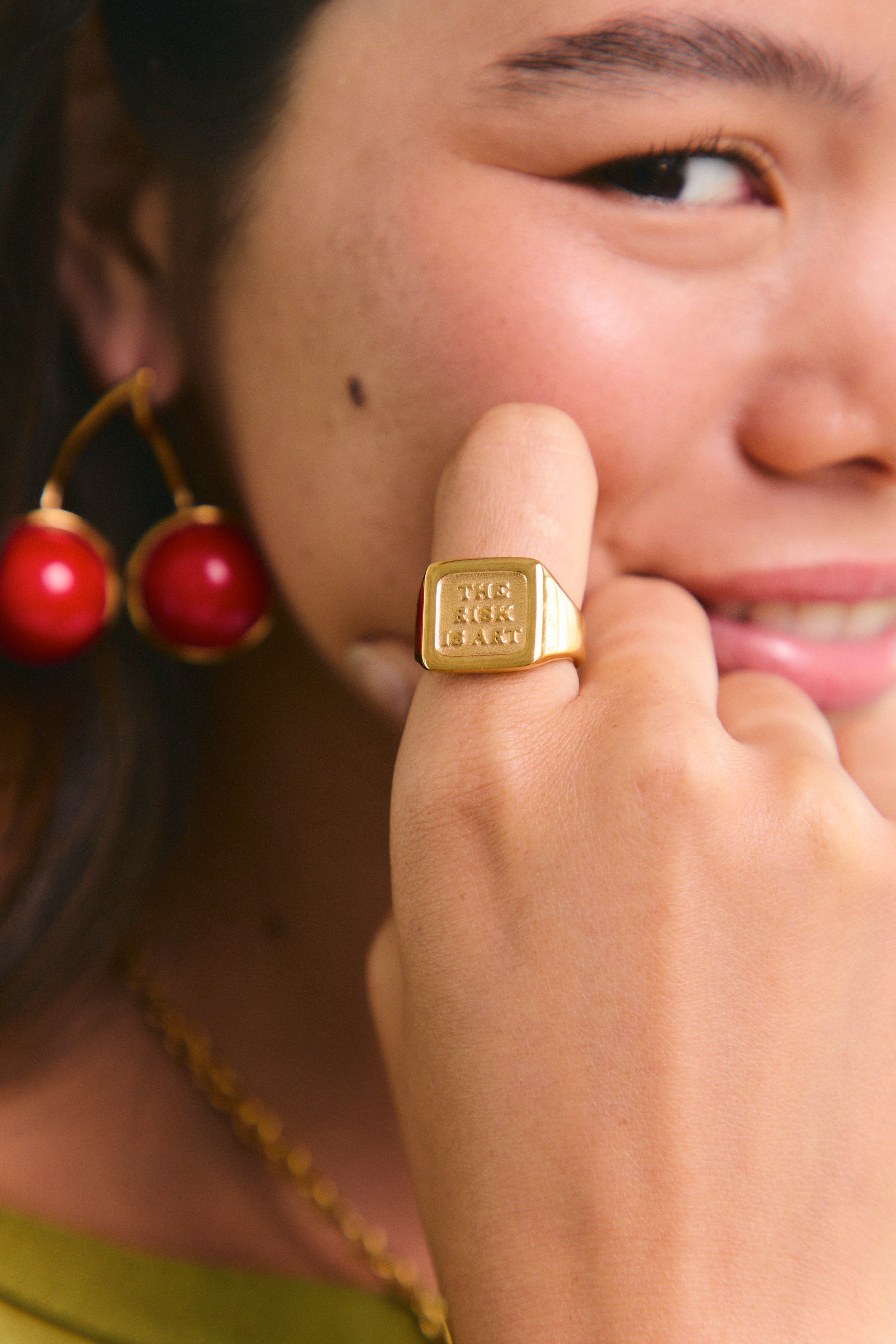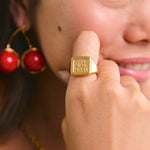 Anillo dorado de acero inoxidable hipoalergénico bañado en oro estilo sello con la frase "risk is art"