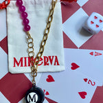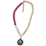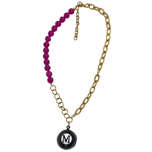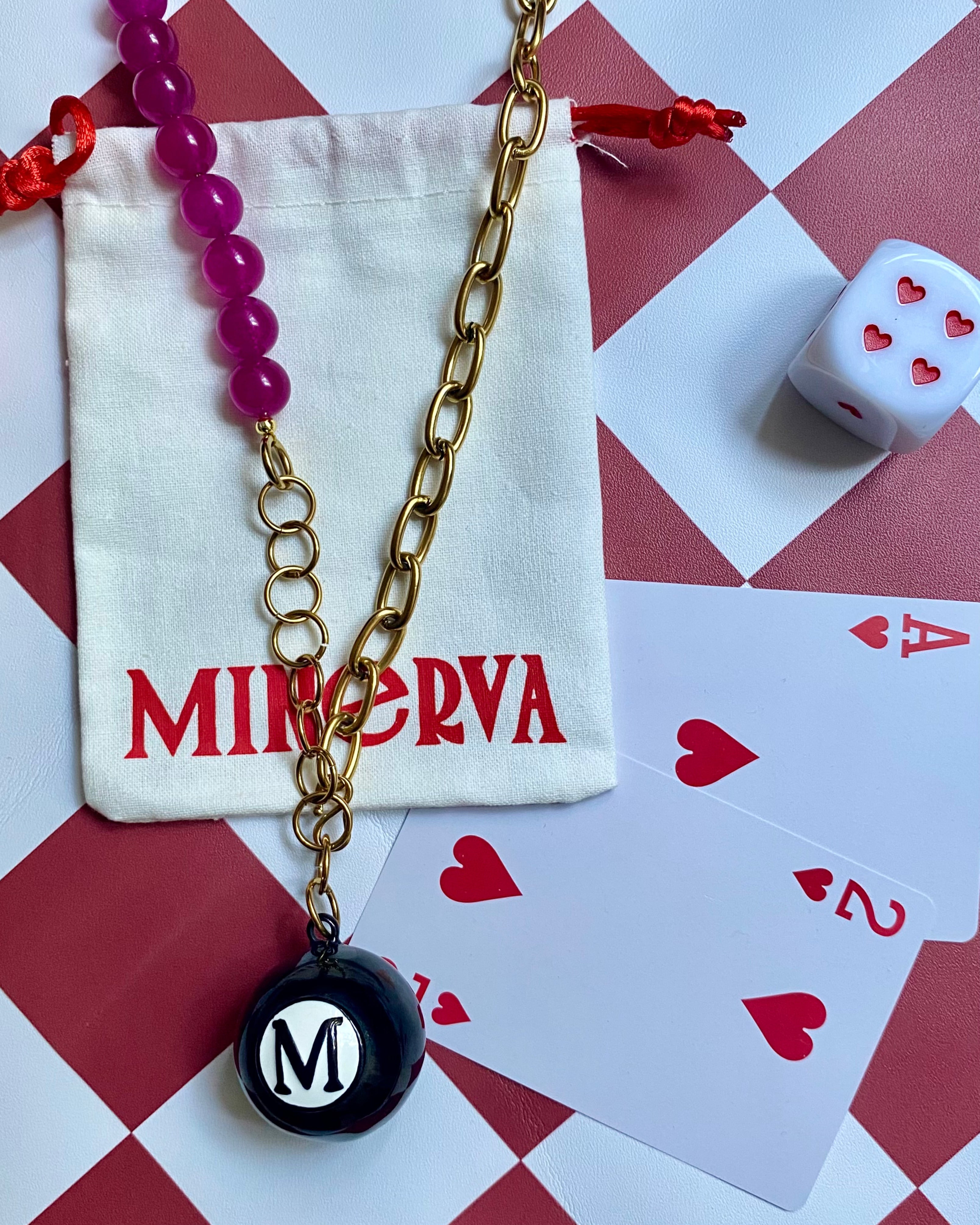 Collar dorado de acero inoxidable hipoalergénico bañado en oro de cadena combinado con cuentas en burgundy y con un charm de una bola de billar negra con la M de minerva