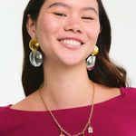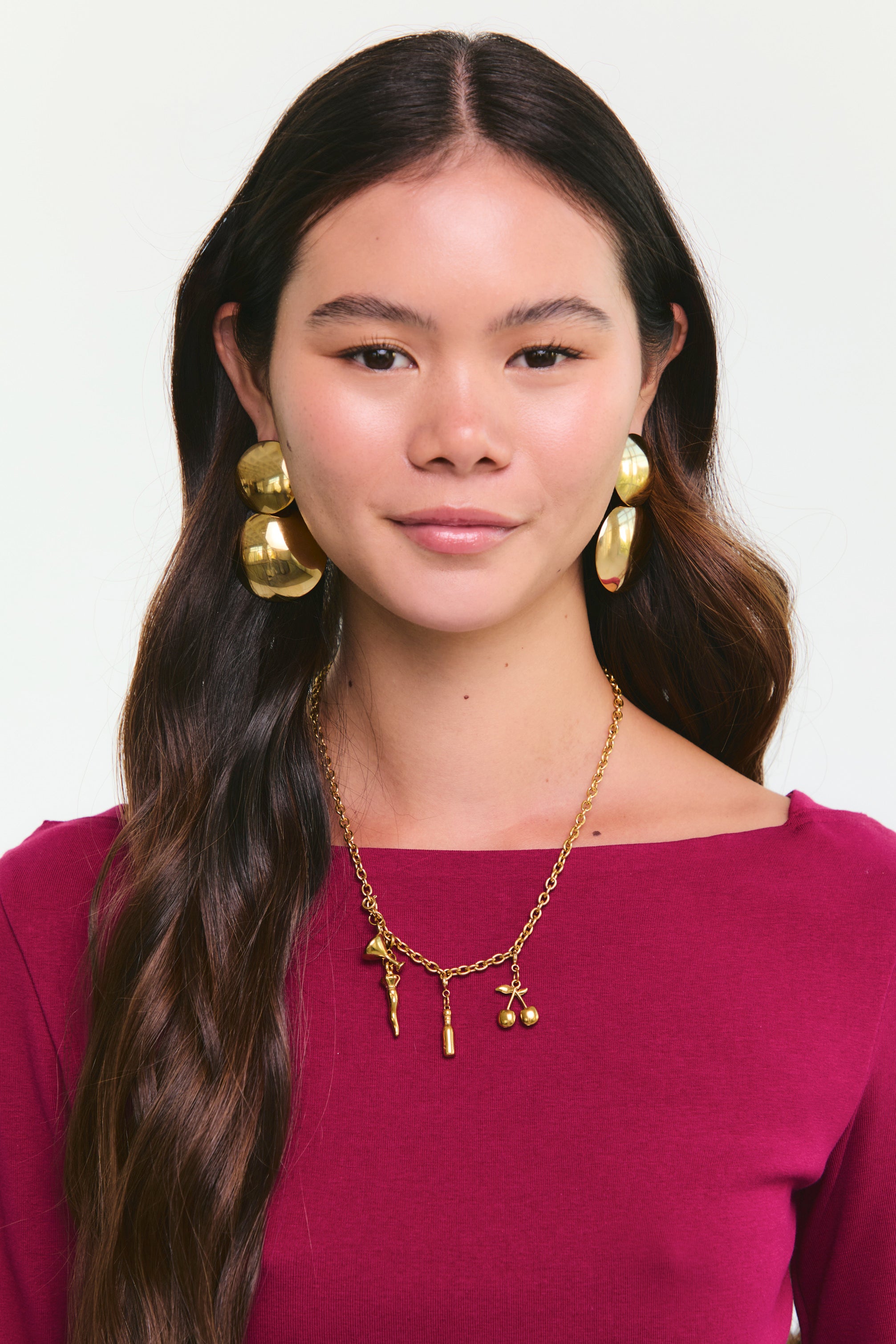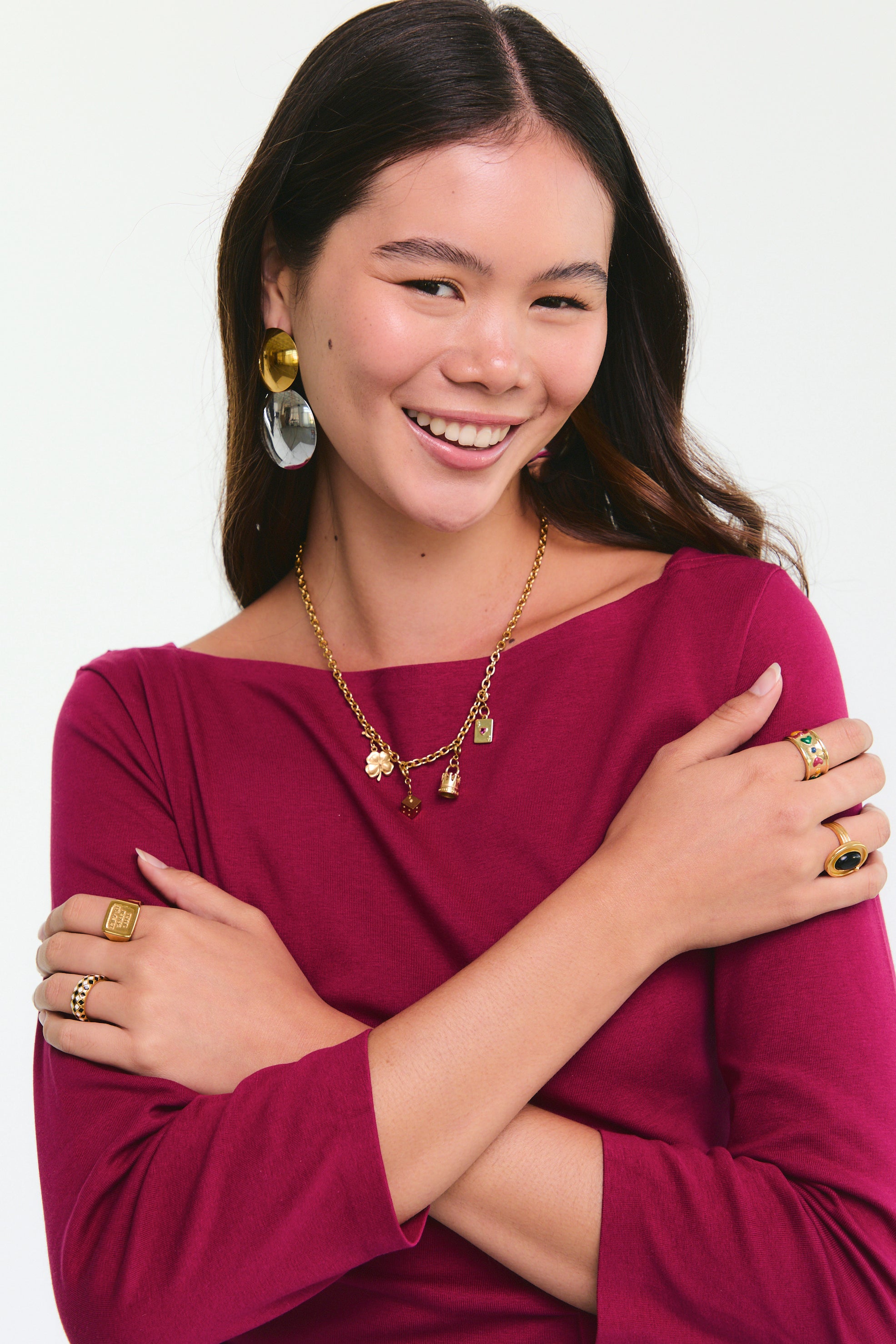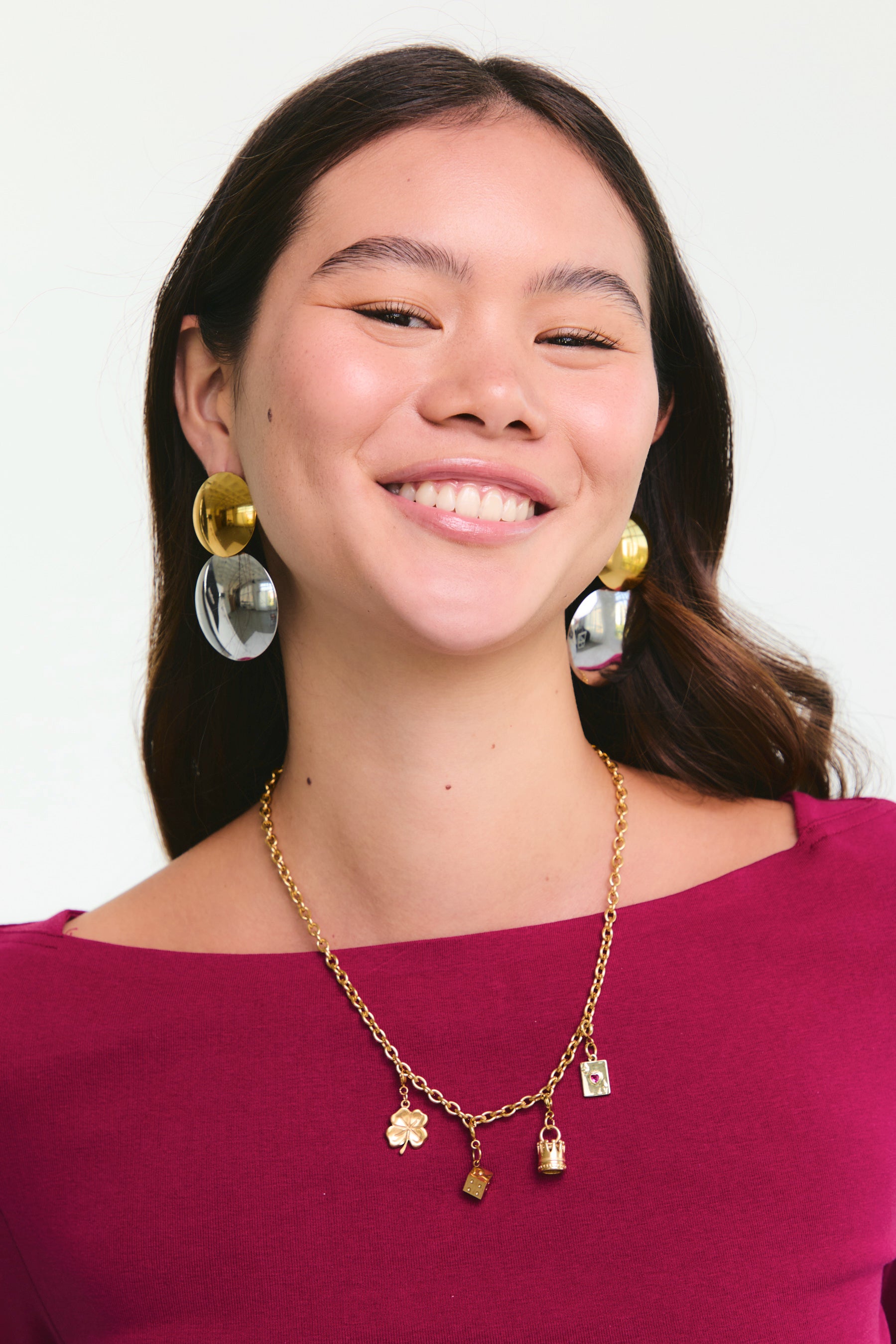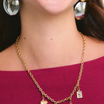 Collar de acero inoxidable hipoalergénico bañado en oro de cadena con 4 charms intercambiables de motivos de la baraja de cartas: un as de corazones, un trebol, una corona y un dado