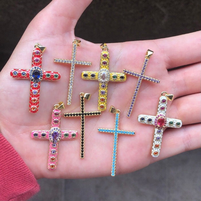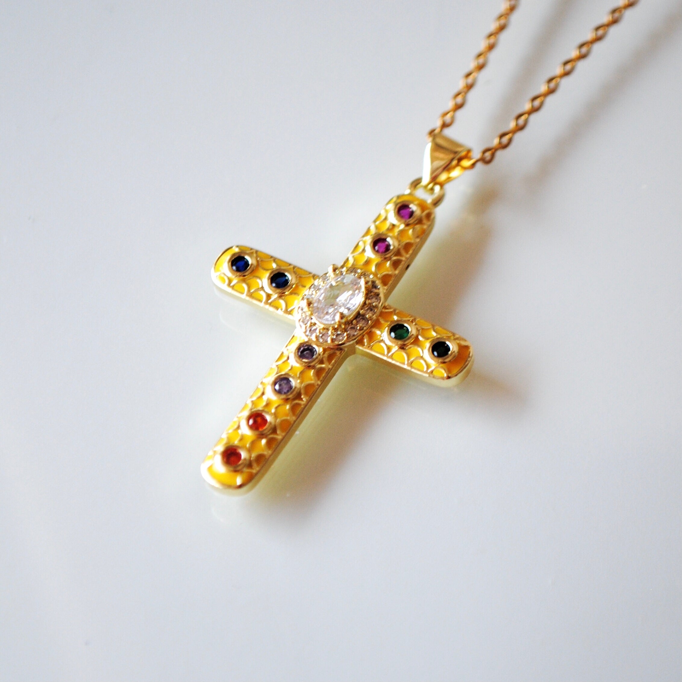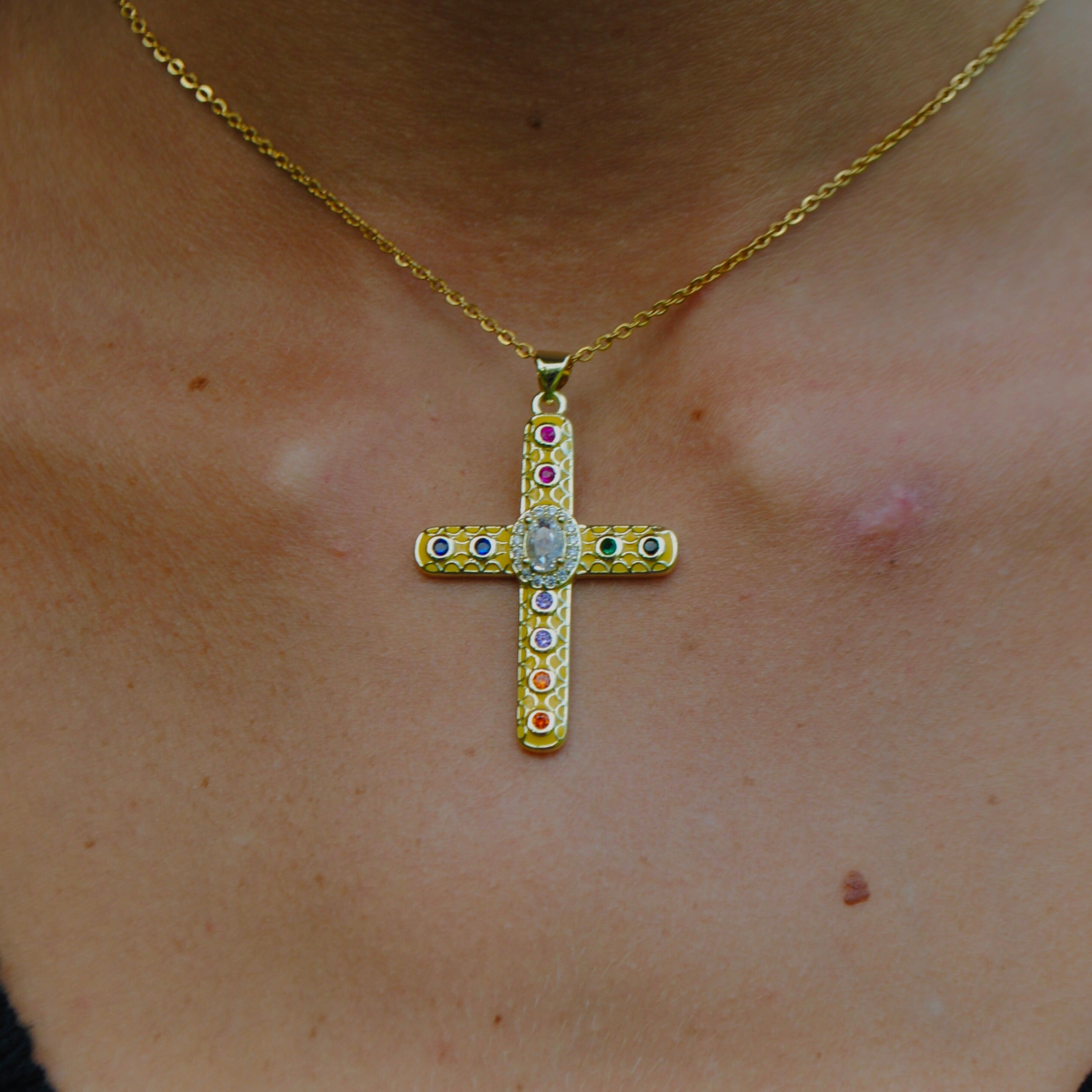 Collar cadena con colgante de una cruz dorada con enamel y esmalte amarillo y con una piedra blanca central y de colores en los extremos.