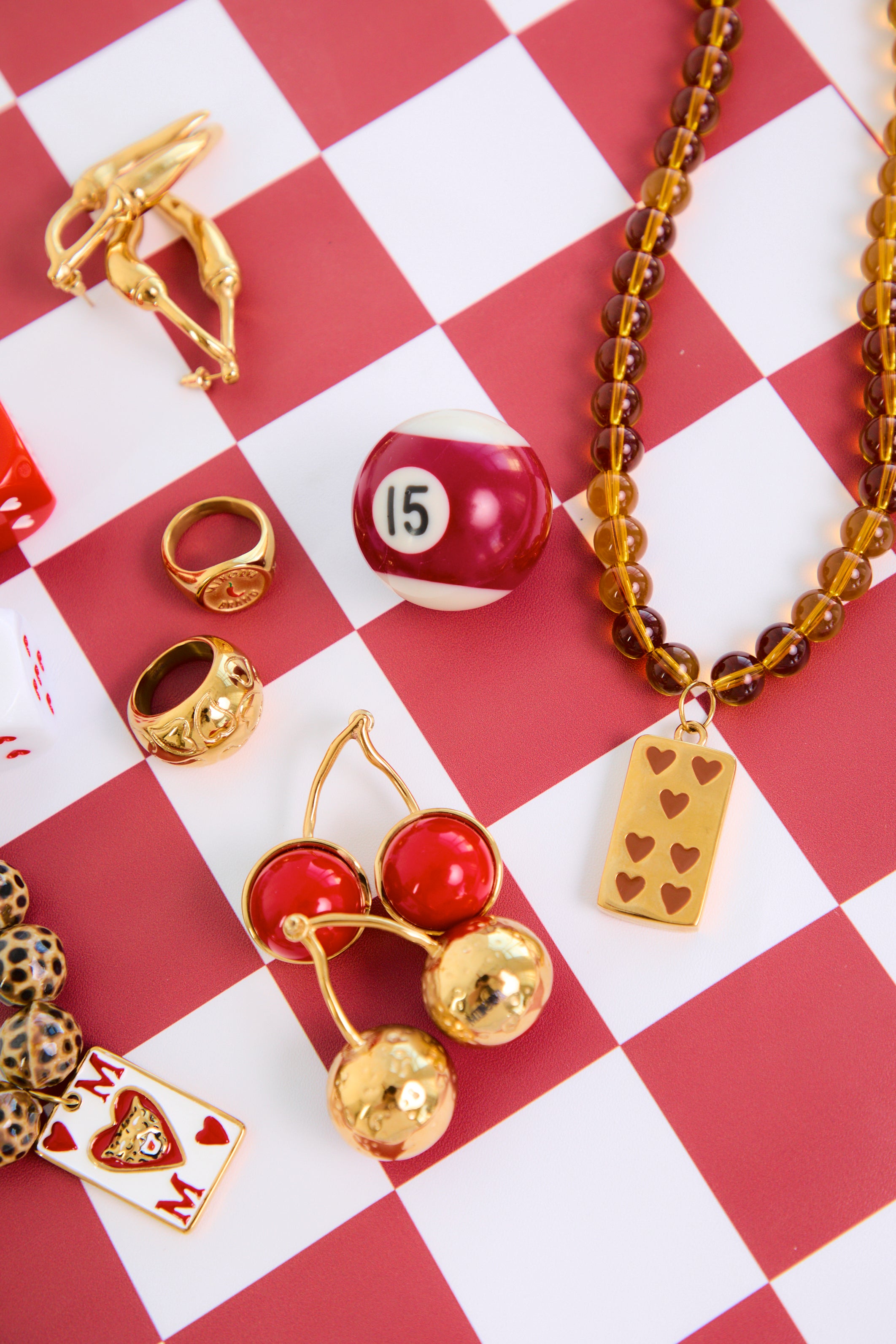 Collar de cuentas marrones con un charm de una pieza de dominó de corazones