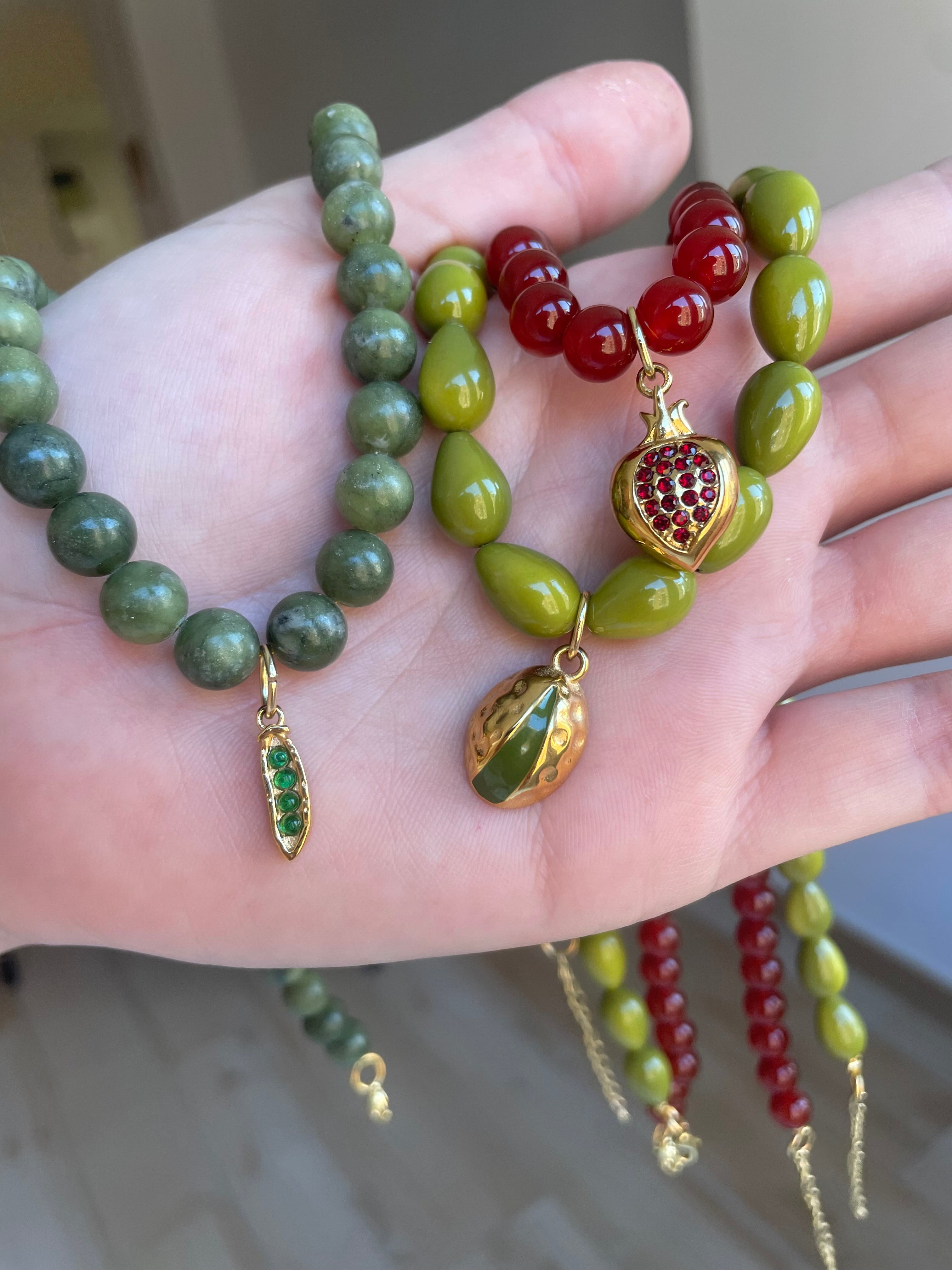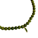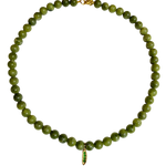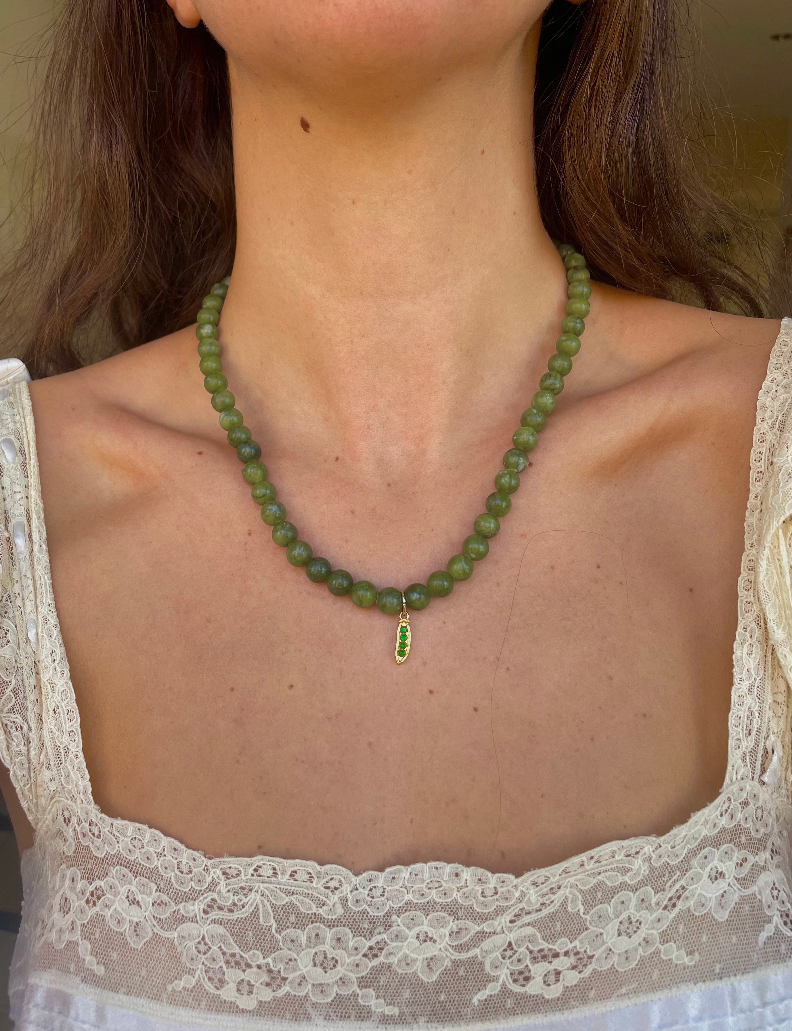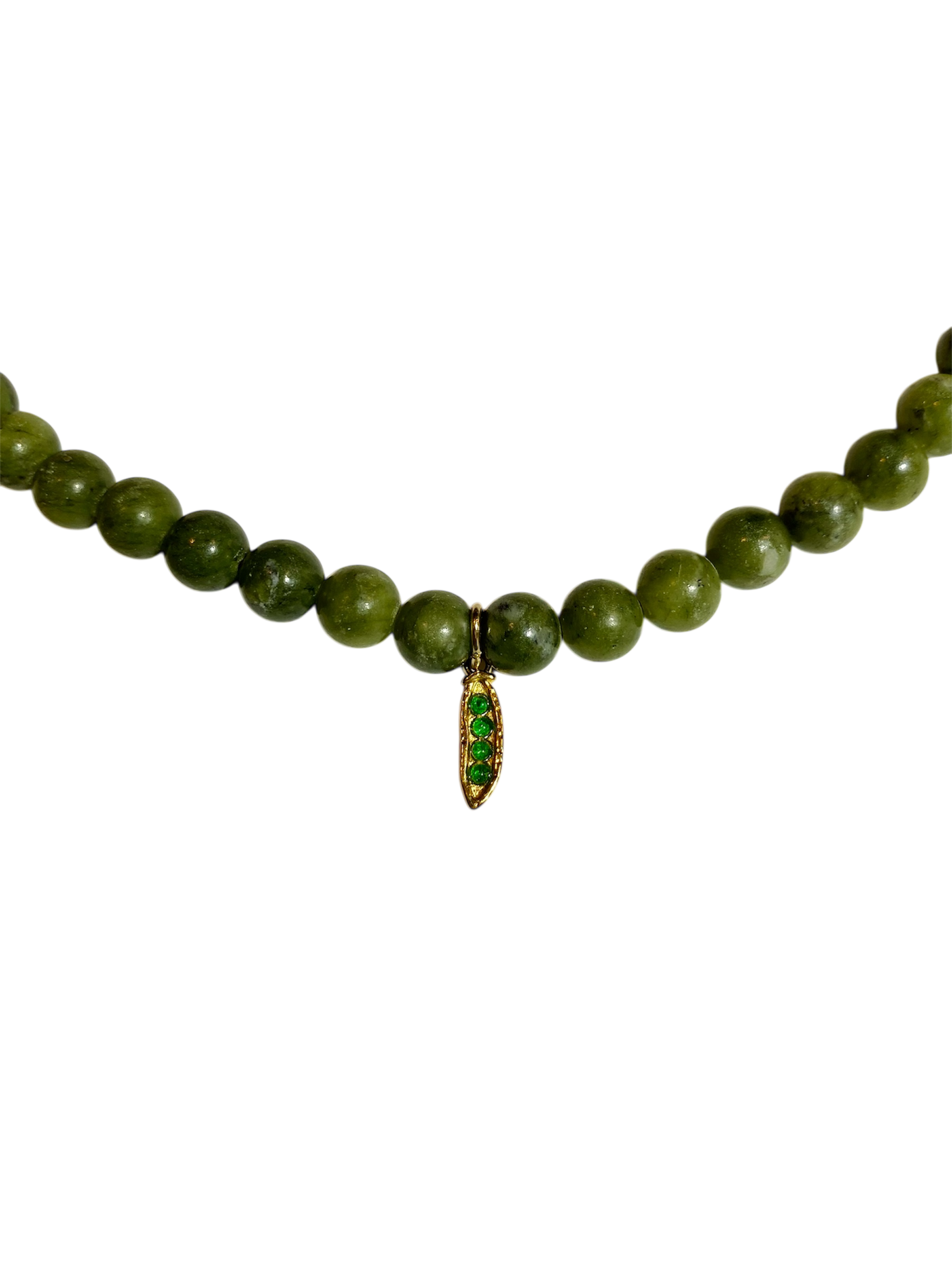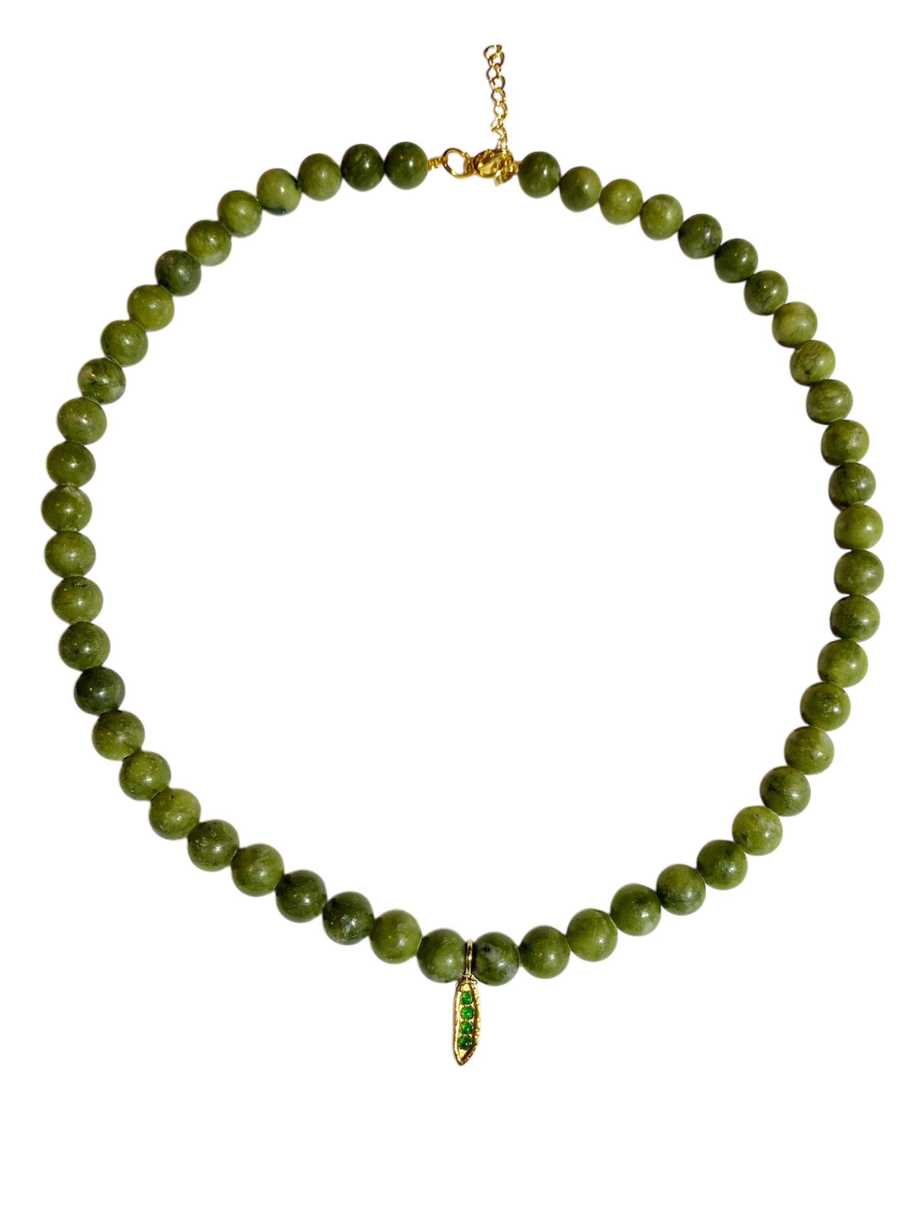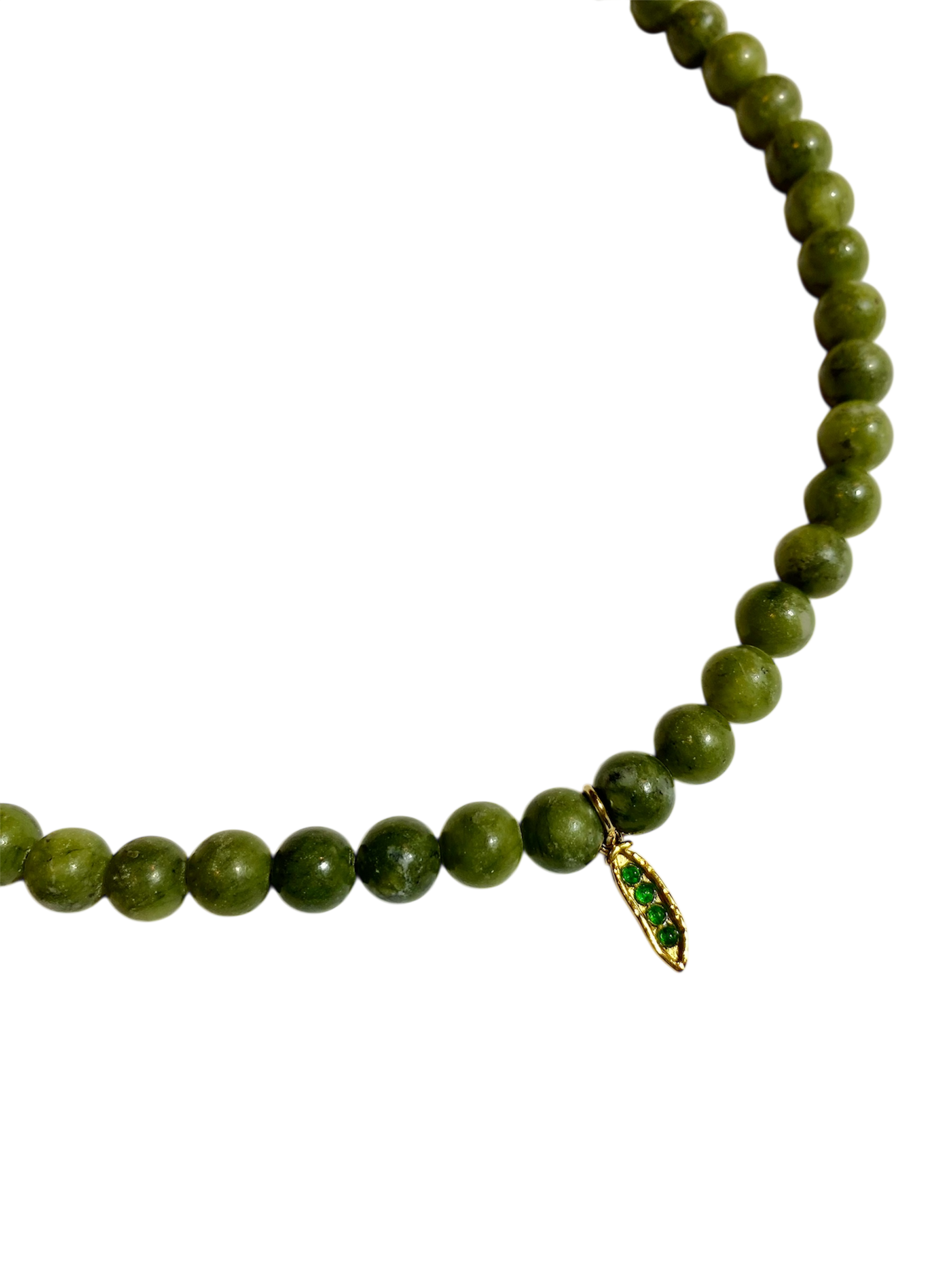 Collar de cuentas redondas de piedra verde, con un charm de una vaina de guisantes dorada de acero inoxidable hipoalergénico bañado en oro y con unas circonitas verdes