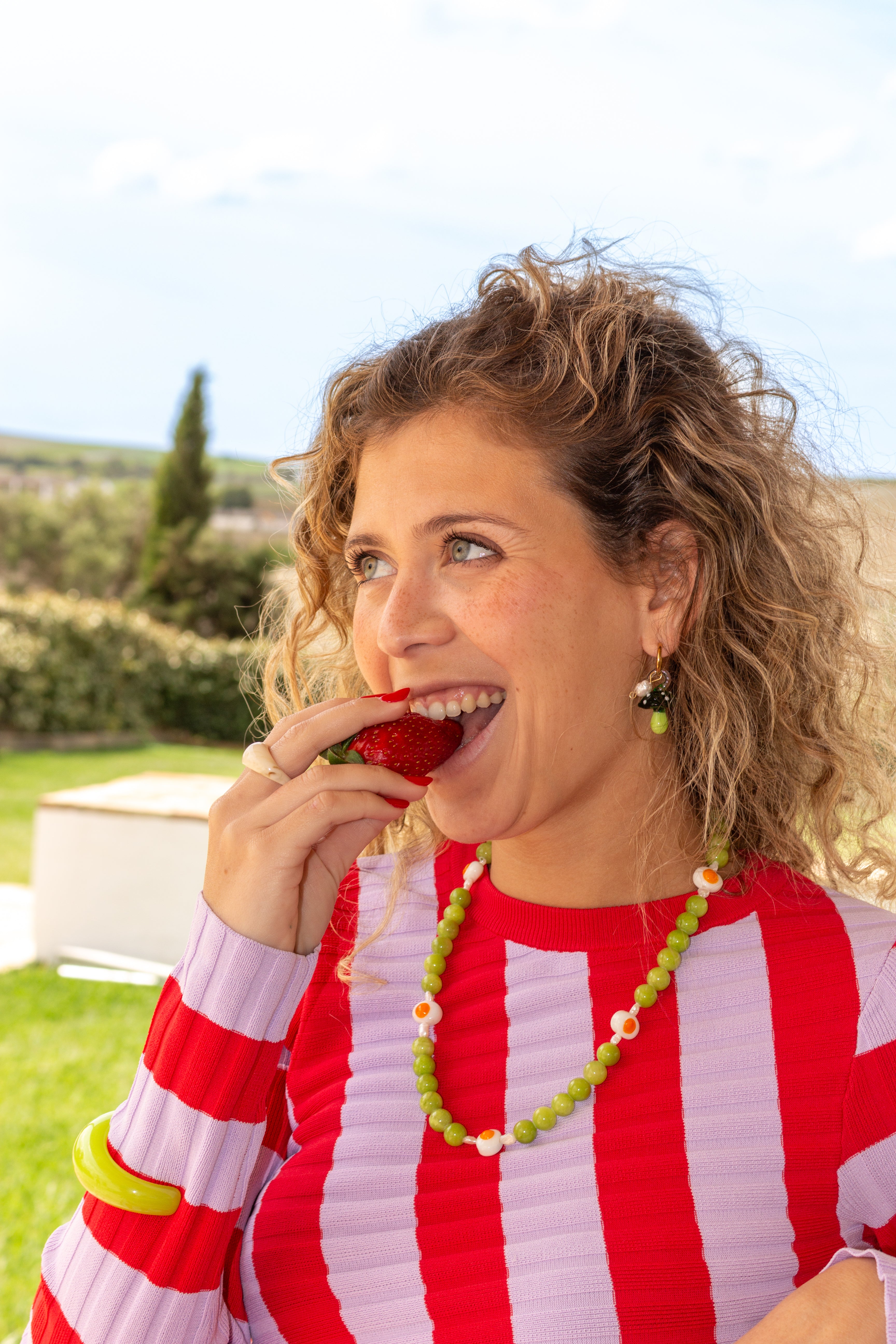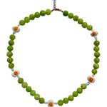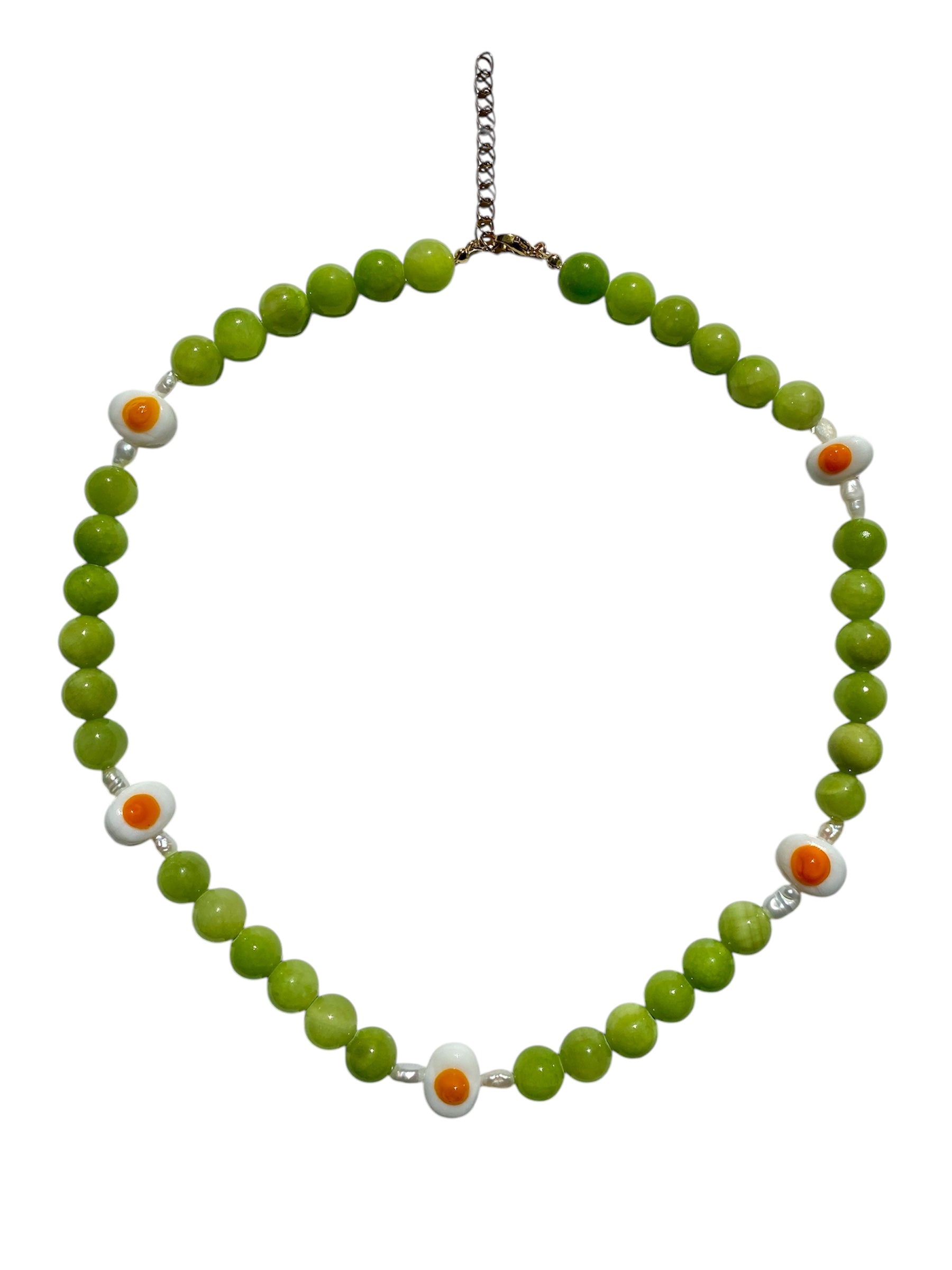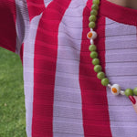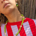 Collar de cuentas de cristal natural color verde lima con charms en forma de huevo de cristal de murano y perlas naturales de río. Diferente, fresco y original