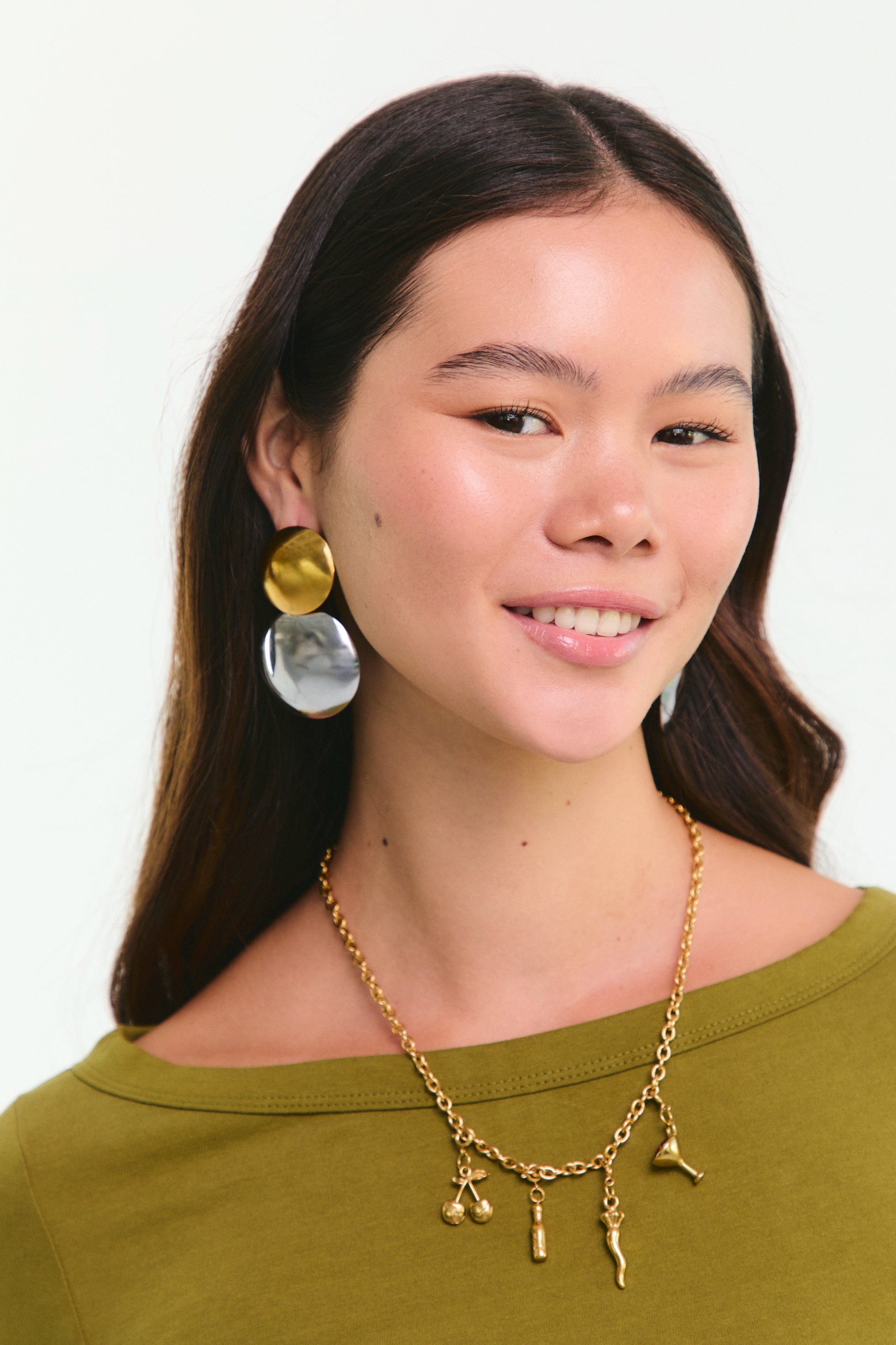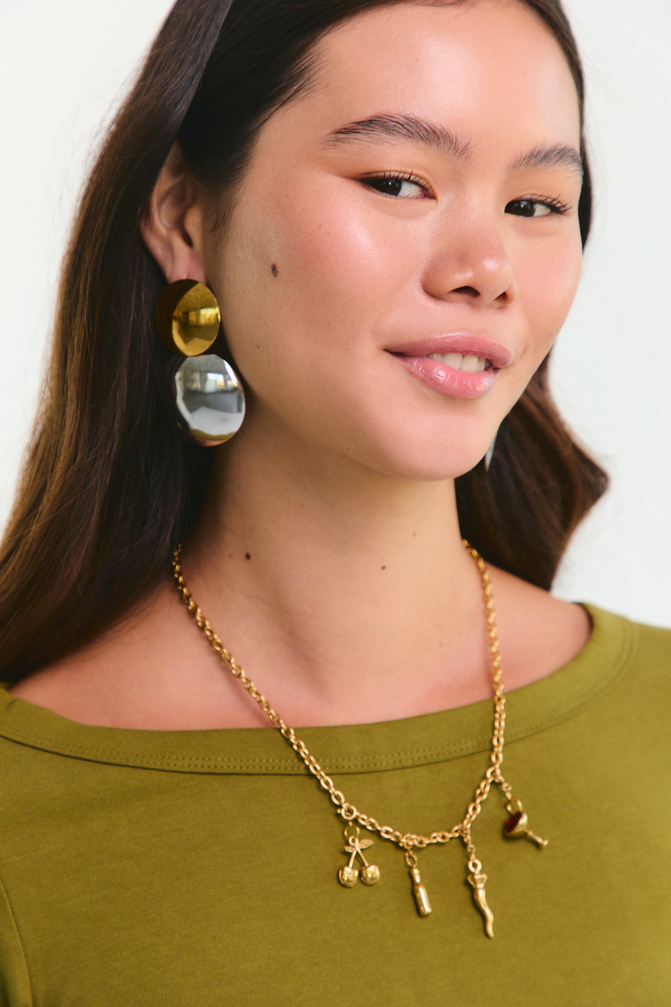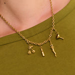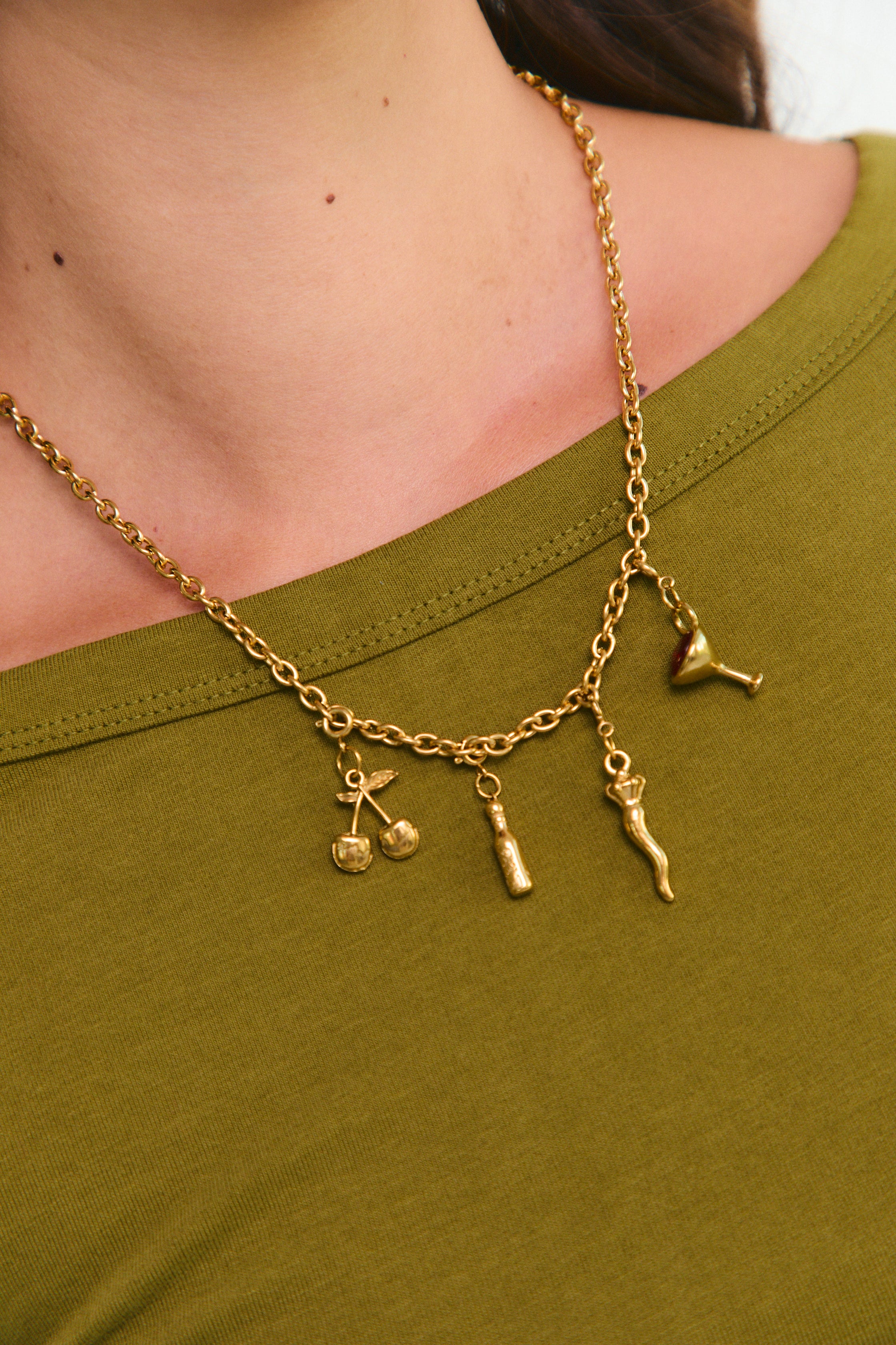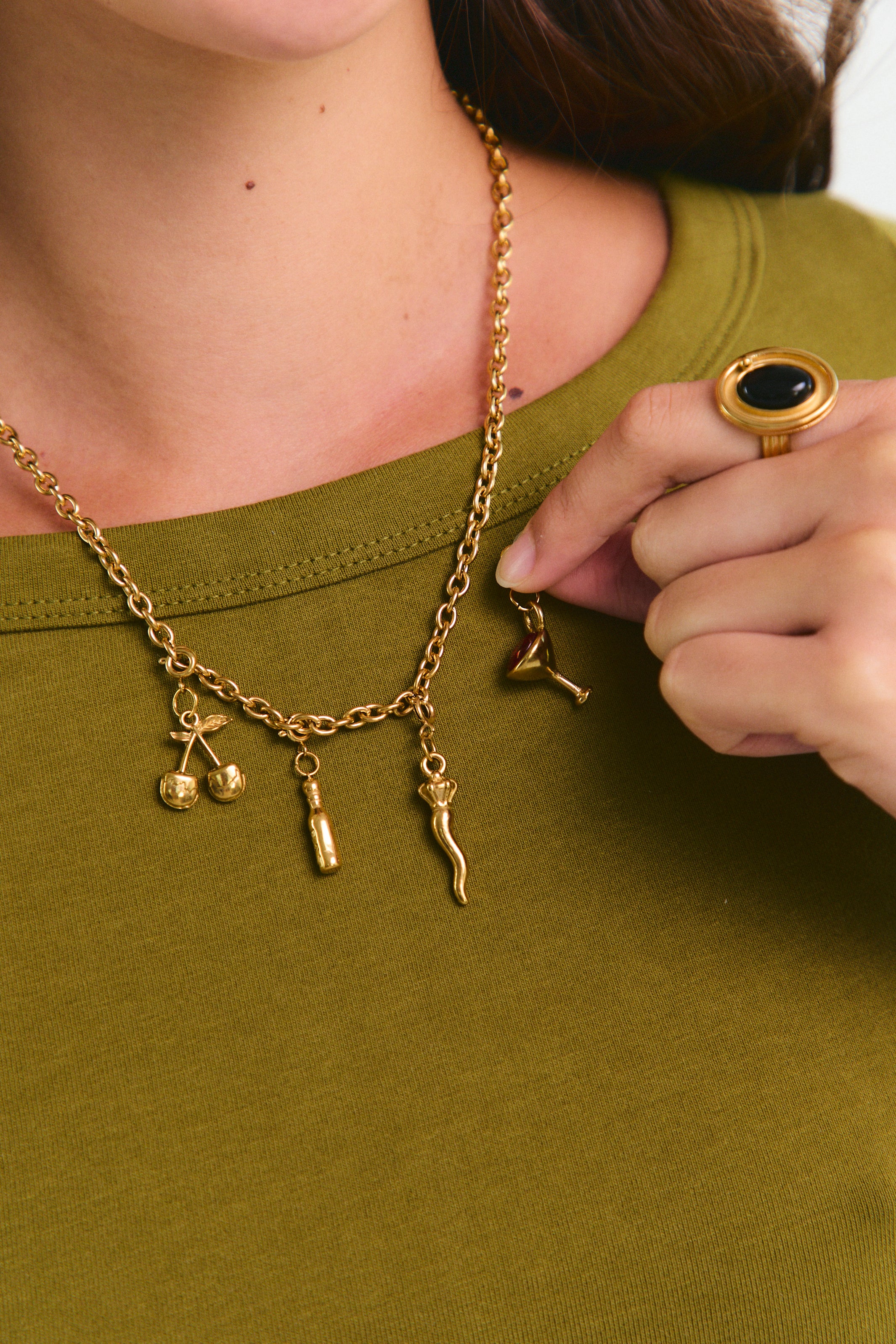 Collar de acero inoxidable hipoalergénico bañado en oro de cadena con 4 charms intercambiables de la suerte: un pimiento, un bote de salsa picante, unas cerezas y una copa de vino