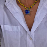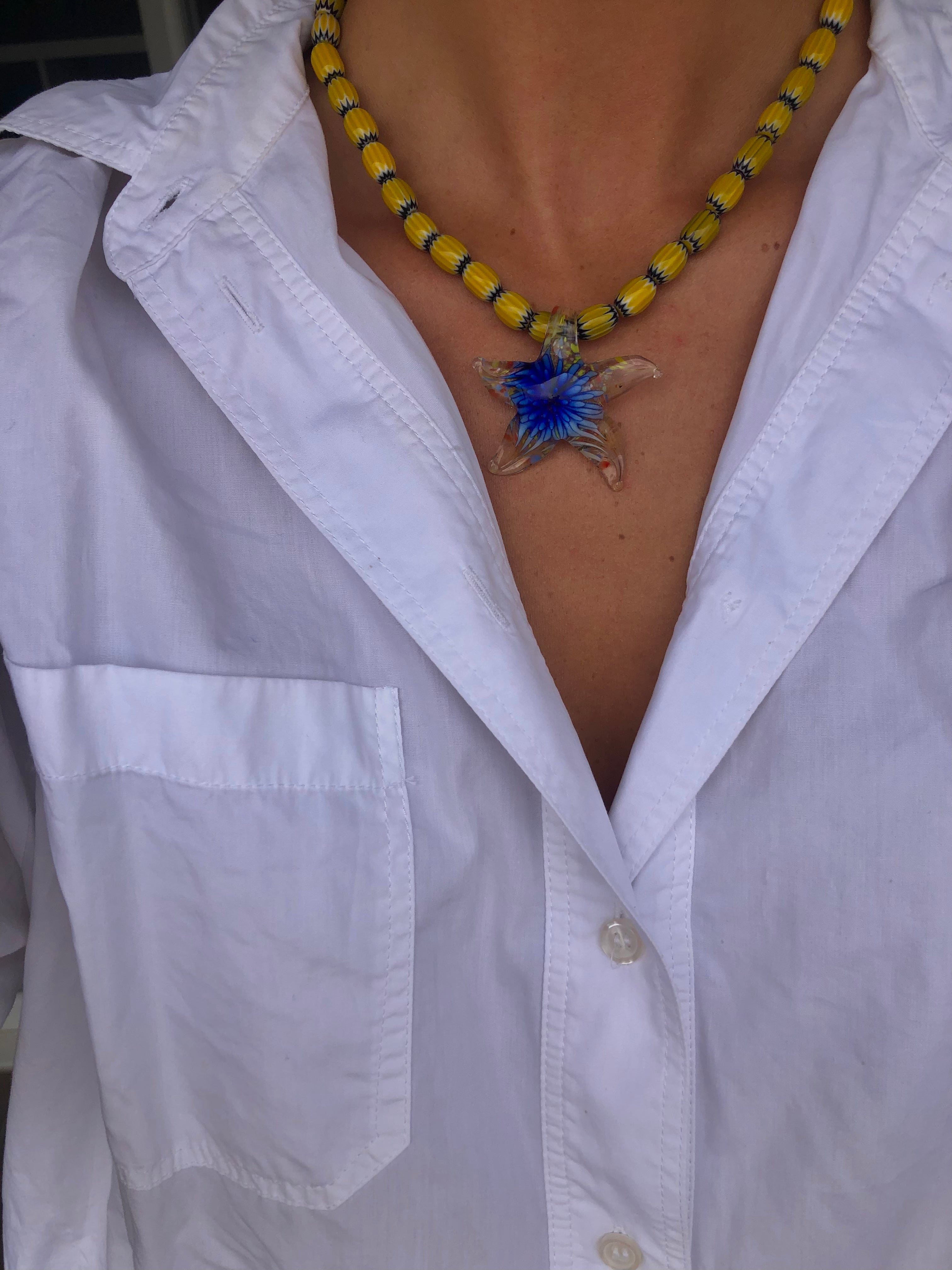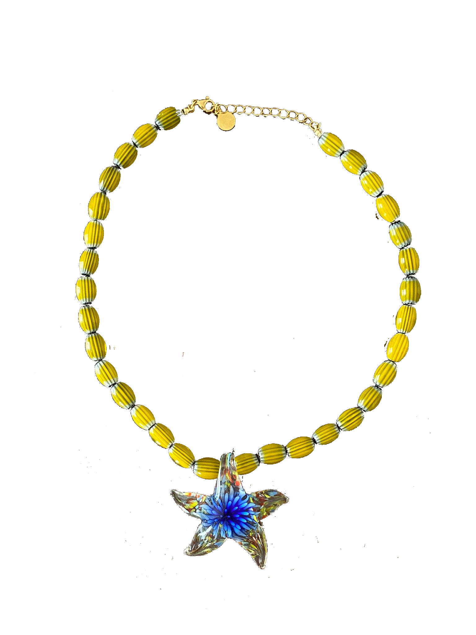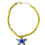 Gargantilla de cuentas de cerámica ovaladas amarillas y azules con un charm de cristal soplado de una estrella de mar azul. Diferente, fresco y original
